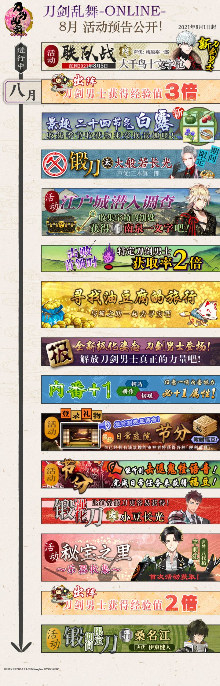 致审神者:《刀剑乱舞-ONLINE-》中文版八月新版本即将开启。刀剑男士将以全新极化之姿登场!「江户城潜入调查」即将开启!「大般若长光」期间限定锻刀、「小豆长光」锻刀强化活动再开! 「寻找油豆腐的旅行」、「秘宝之里~乐器收集~」、登录赠「节分」景趣、「二十四节气 白露·龙胆」景趣等活动也即将上线。更多活动相关详情,敬请留意后续官方情报。以下为《刀剑乱舞-ONLINE-》中文版2021年八月活