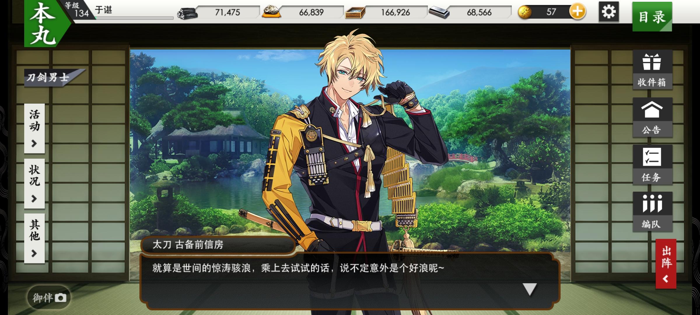 部桑镇楼⦁֊⦁之前只是在看同人,1.8才决心来来试试游戏的,听说地下城很适合练级所以在地下城泡到结束养出了一个太刀和大太刀混合队伍,中期卡第六章才知道要练短刀所幸也肝出了一队,结束前两天在80层捞到了白山,满配队冲到95层下不去了,听说90+层没有丙子很难打所以准备捞一把丙子·͜·目前药研博多信浓已极化,乱修行中,回来准备送不动去但是道具不齐,7-4不知道咋过_(´ཀ`」 ∠)__ 前些天为