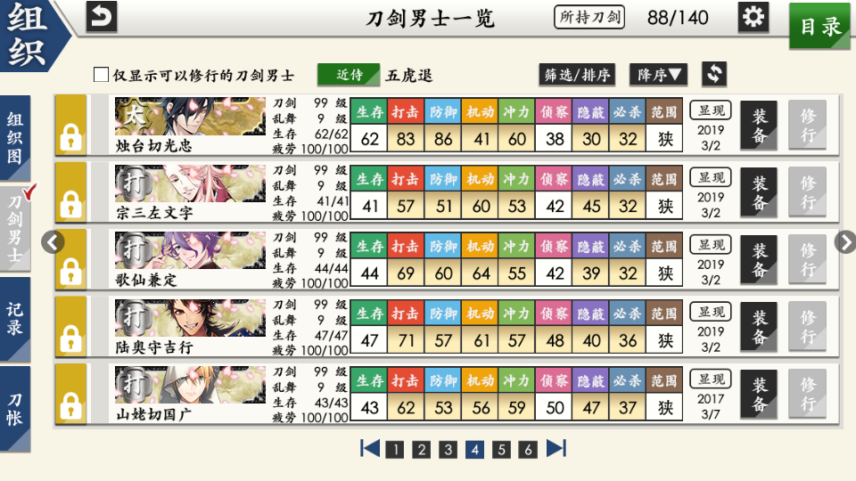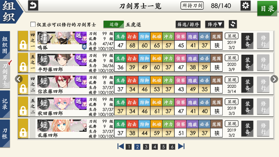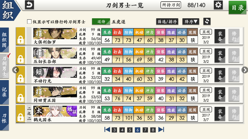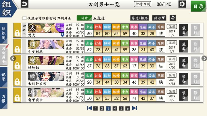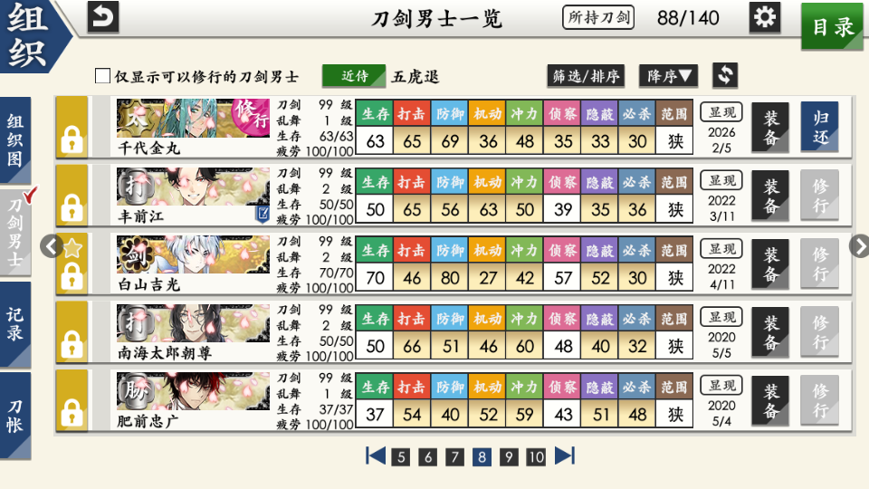 部桑镇楼⦁֊⦁之前只是在看同人,1.8才决心来来试试游戏的,听说地下城很适合练级所以在地下城泡到结束养出了一个太刀和大太刀混合队伍,中期卡第六章才知道要练短刀所幸也肝出了一队,结束前两天在80层捞到了白山,满配队冲到95层下不去了,听说90+层没有丙子很难打所以准备捞一把丙子·͜·目前药研博多信浓已极化,乱修行中,回来准备送不动去但是道具不齐,7-4不知道咋过_(´ཀ`」 ∠)__ 前些天为