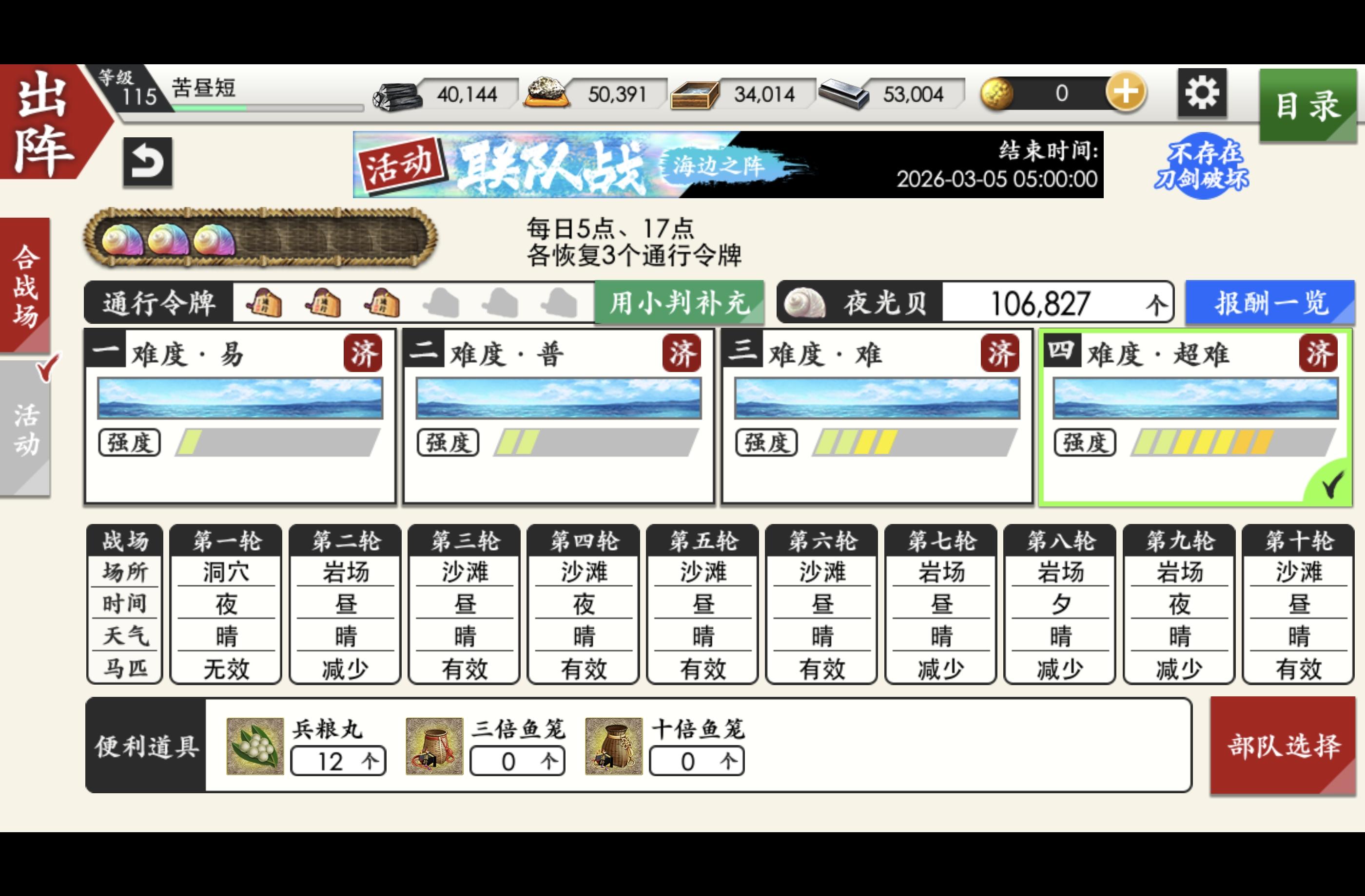 本来是想着满30w就行,这样的话其实按照理想状态可以不用买门票,免费门票全e4的情况下是能直接单通的。首日6+3,因为手欠想打买了6张玩hh,e1、e2、e3为了满任务单通了一遍,e4打了12次,前期两个三倍鱼笼到手直接用掉了。抛开三倍的夜光贝,大概2200*2=4400,不管难度导致的获得差异,就算15战,30000/15=2000,场均2k,这是比较理想的,因为彩贝基本可以一局e4一局彩虹