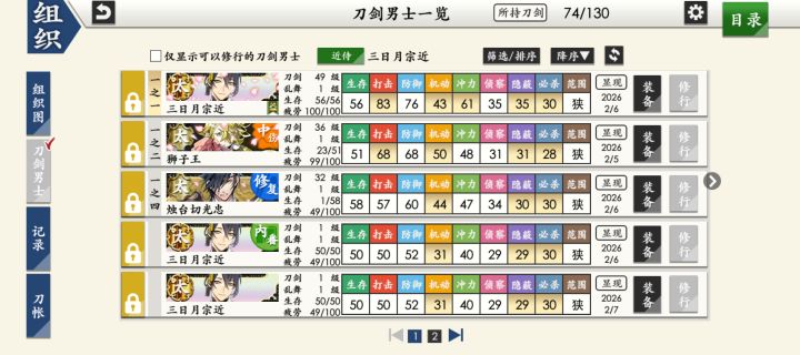 部桑镇楼⦁֊⦁之前只是在看同人,1.8才决心来来试试游戏的,听说地下城很适合练级所以在地下城泡到结束养出了一个太刀和大太刀混合队伍,中期卡第六章才知道要练短刀所幸也肝出了一队,结束前两天在80层捞到了白山,满配队冲到95层下不去了,听说90+层没有丙子很难打所以准备捞一把丙子·͜·目前药研博多信浓已极化,乱修行中,回来准备送不动去但是道具不齐,7-4不知道咋过_(´ཀ`」 ∠)__ 前些天为