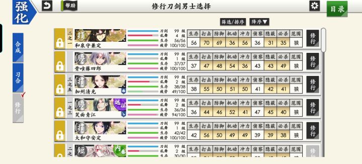 部桑镇楼⦁֊⦁之前只是在看同人,1.8才决心来来试试游戏的,听说地下城很适合练级所以在地下城泡到结束养出了一个太刀和大太刀混合队伍,中期卡第六章才知道要练短刀所幸也肝出了一队,结束前两天在80层捞到了白山,满配队冲到95层下不去了,听说90+层没有丙子很难打所以准备捞一把丙子·͜·目前药研博多信浓已极化,乱修行中,回来准备送不动去但是道具不齐,7-4不知道咋过_(´ཀ`」 ∠)__ 前些天为
