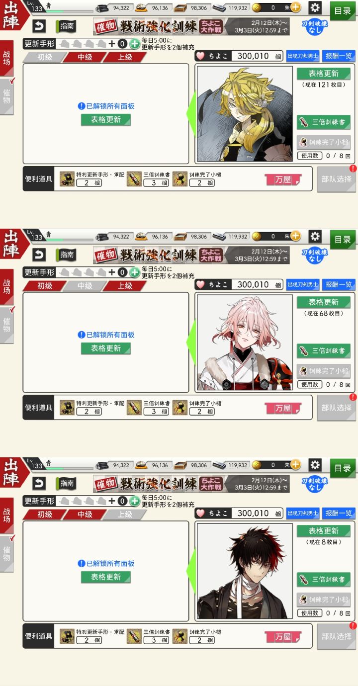 截至2026/2/15接近16日0点❀初级121回,中级68回,上级8回,打满30w结果送的几个道具一个没动(不太知道啥效果,刚开始是想着慎用,结果打到现在也没用hh❀活动能刷出的刀刀们还差6位没开图鉴(p3,大典太光世/日本号/巴形薙刀/南泉一文字/南海太郎朝尊/松井江)接下来慢慢刷看能不能刷出来吧❀有获取上限的几位,目前福岛光忠2/2,云生、云次、云重都是1