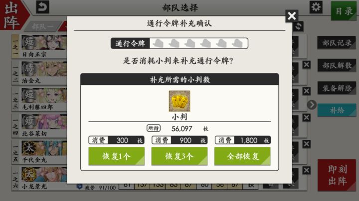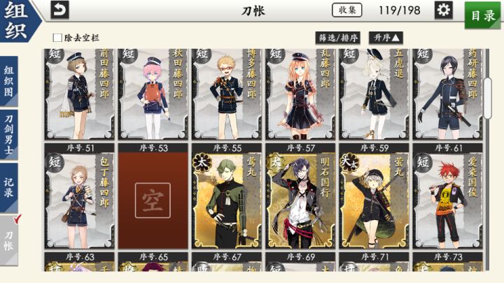 部桑镇楼⦁֊⦁之前只是在看同人,1.8才决心来来试试游戏的,听说地下城很适合练级所以在地下城泡到结束养出了一个太刀和大太刀混合队伍,中期卡第六章才知道要练短刀所幸也肝出了一队,结束前两天在80层捞到了白山,满配队冲到95层下不去了,听说90+层没有丙子很难打所以准备捞一把丙子·͜·目前药研博多信浓已极化,乱修行中,回来准备送不动去但是道具不齐,7-4不知道咋过_(´ཀ`」 ∠)__ 前些天为