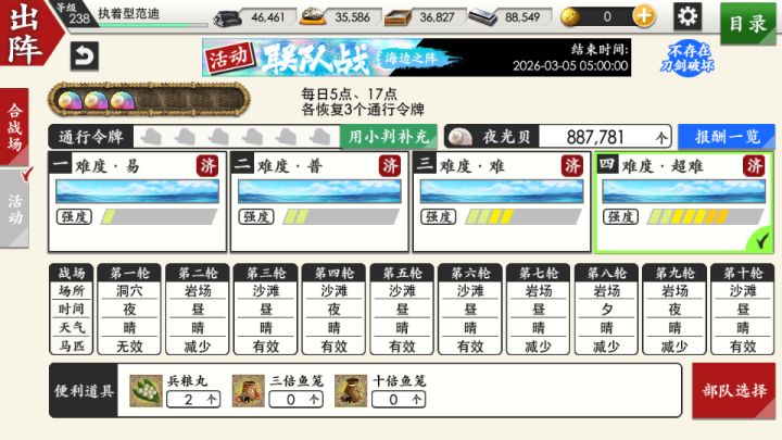 本来是想着满30w就行,这样的话其实按照理想状态可以不用买门票,免费门票全e4的情况下是能直接单通的。首日6+3,因为手欠想打买了6张玩hh,e1、e2、e3为了满任务单通了一遍,e4打了12次,前期两个三倍鱼笼到手直接用掉了。抛开三倍的夜光贝,大概2200*2=4400,不管难度导致的获得差异,就算15战,30000/15=2000,场均2k,这是比较理想的,因为彩贝基本可以一局e4一局彩虹