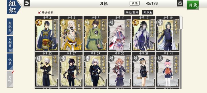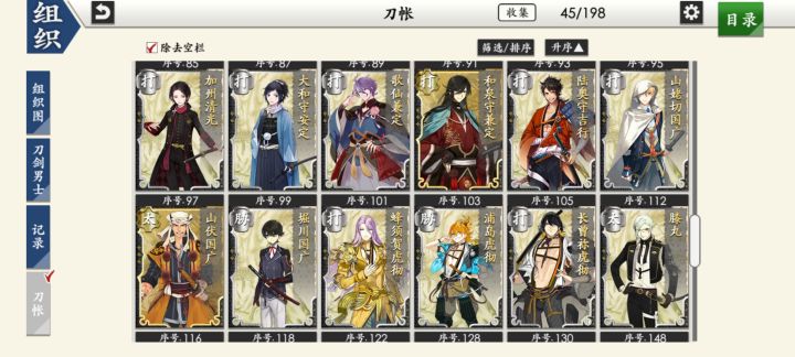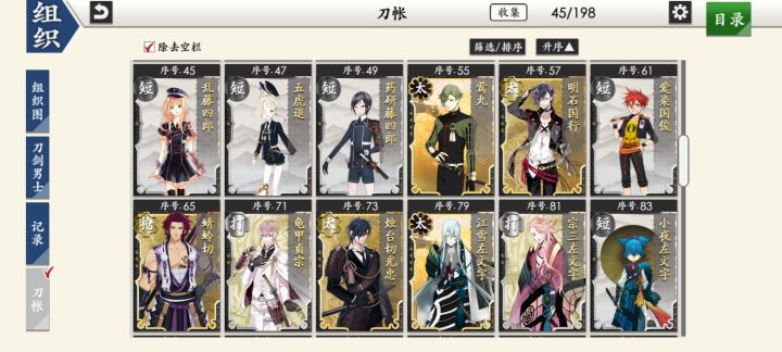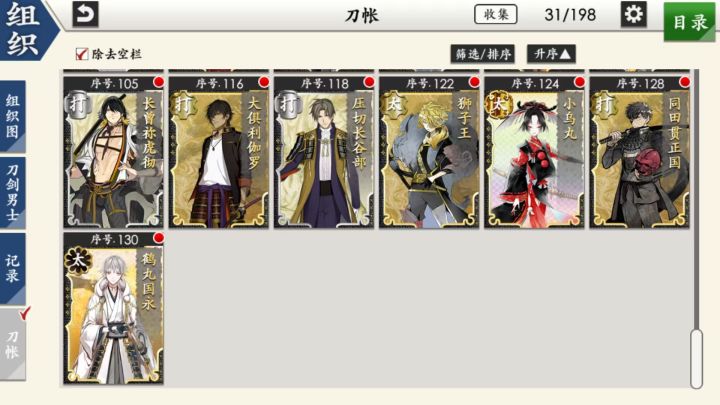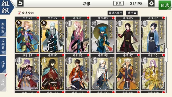 部桑镇楼⦁֊⦁之前只是在看同人,1.8才决心来来试试游戏的,听说地下城很适合练级所以在地下城泡到结束养出了一个太刀和大太刀混合队伍,中期卡第六章才知道要练短刀所幸也肝出了一队,结束前两天在80层捞到了白山,满配队冲到95层下不去了,听说90+层没有丙子很难打所以准备捞一把丙子·͜·目前药研博多信浓已极化,乱修行中,回来准备送不动去但是道具不齐,7-4不知道咋过_(´ཀ`」 ∠)__ 前些天为