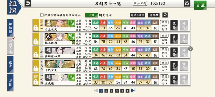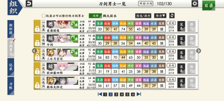 如图,所有的修行道具先去送短刀们极化,然后现在一队里头就差一个短刀没有极化了,然后是送什么刀种的刀去极化,还是先让刀先99攒点经验?然后后面大概就是发一点牢骚,可以选择不看哟●▽●大概就是我入坑的时间真巧啊,12月27日入的坑,我要是晚点入坑的话,我就能蹭上那个新任审神者应援活动了,当时那几天还不怎么会玩,但是我已经不能换服了,为什么?因为就在1月1日前那天我开了月卡那两张月卡都开了,本人就是嗯