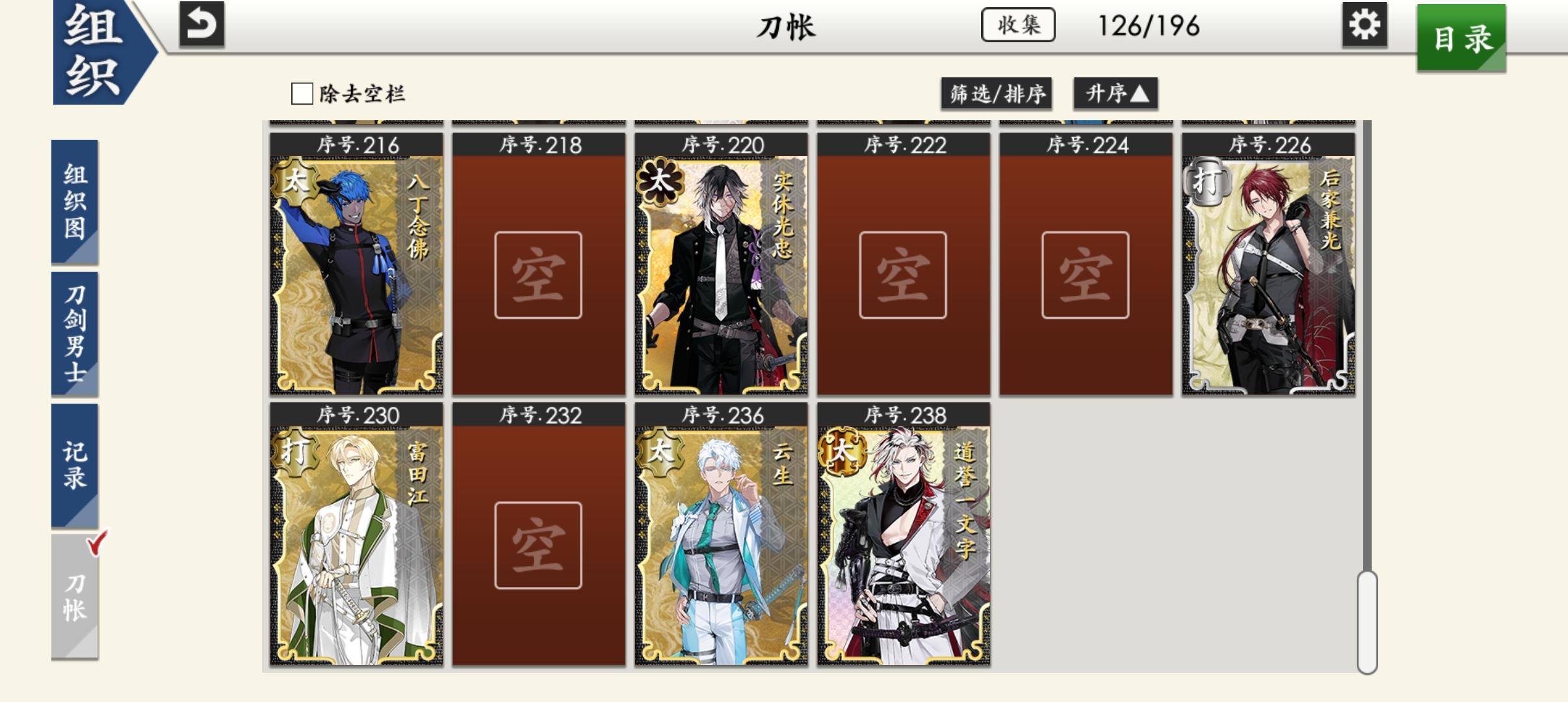 记录一下,今天已经打通地下城啦!(有丙子就是爽)都已经半年了,我是赶上好时候了,巧克力,南瓜,还有那个96的贴纸,让我集图鉴轻松好多,就差p2的四个啦。只极化了短刀,修行不是要四天嘛,我就想着有道具就送出去,想要满图鉴。目前是千代金丸出去了,因为后面有海联,北谷菜切现在才70来级,之后联队战练完级再送。