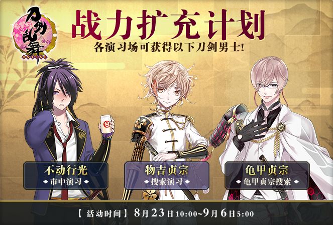 致审神者:感谢各位审神者对《刀剑乱舞-ONLINE-》的支持,为了让审神者体验更多的游戏内容,获得更好的游戏体验,本周我们将于8月22日进行版本更新,并于8月23日10:00开启全新活动。本次更新不会影响正在游戏中的审神者,审神者只需在更新结束后,重新登录游戏即可。本周活动内容如下:1、 龟甲贞宗搜索 战力扩充计划再开【开启时间】8月23日10:00~9月6日5:00【活动详情】活动期间