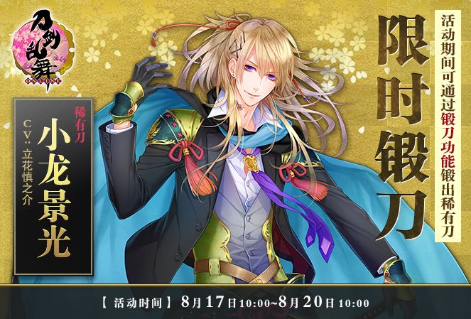 致审神者:感谢各位审神者对《刀剑乱舞-ONLINE-》的支持,为了让审神者体验更多的游戏内容,获得更好的游戏体验,本周我们将于8月16日10:00在游戏内开启全新系列活动。本周活动内容如下:1、 小龙景光 限时锻刀再开【活动时间】8月17日10:00~8月20日10:00【活动详情】活动期间,通过锻刀功能,审神者有机会锻出【太刀·小龙景光】。 2、小龙景光限锻礼包 限时上架【活动时
