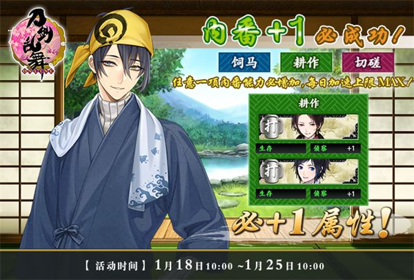 致审神者:感谢各位审神者对《刀剑乱舞-ONLINE-》的支持,为了让审神者体验更多游戏内容,获得更好的游戏体验,我们将于1月18日10:00开启活动。本次更新内容如下:内番必成功【活动时间】1月18日10:00-1月25日10:00【活动详情】活动期间内,刀剑男士内番必成功,同时内番符限时特价,可快速完成一位刀剑男士的内番工作,预购从速。内番符特惠包:内含内番符*15。原价1200甲