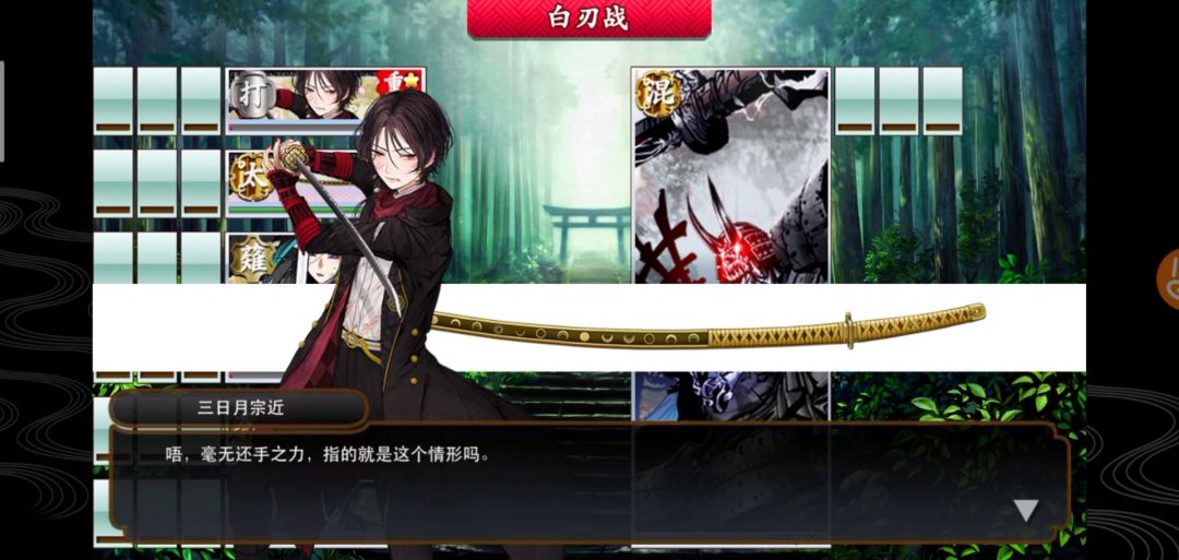 上线给剧情刀到了,呜呜,看爷爷说真是个断刀的好时候,我就一惊,真的给我吓到了,内心秒飘过(没有我的允许你怎么能私自断刀😭,三明没有你我怎么活啊😭,你不要自我了断啊😭) (总结:剧情很好的用三日月刀穿了我的刀,回头就送爷爷出去开导内心🙏)