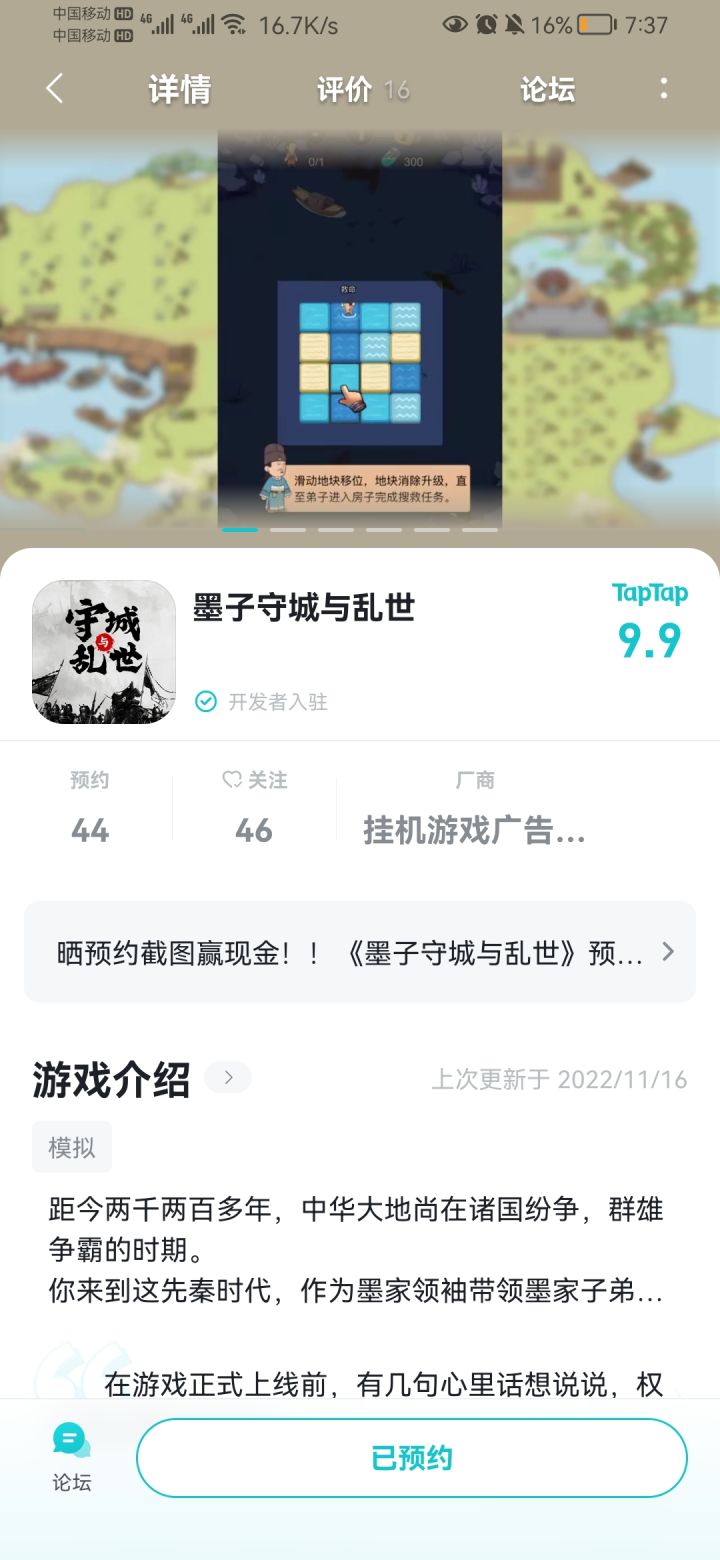 开门见山的说,为了感谢大家的支持,我们为诸位钜子大人们准备了一份小小的礼物,本贴子下回复晒出预约截图就可以参加活动赢现金奖励【活动时间】11月23日 —《墨子守城与乱世》上线日截止【参与方式】预约并打分评价《墨子守城与乱世》,并在该帖内发送评价区评论后截图,如:以下示例【活动奖励】预约满300抽取1个50元预约满500抽取2个50元预约满1000抽取1个100元PS:抽取方式将根