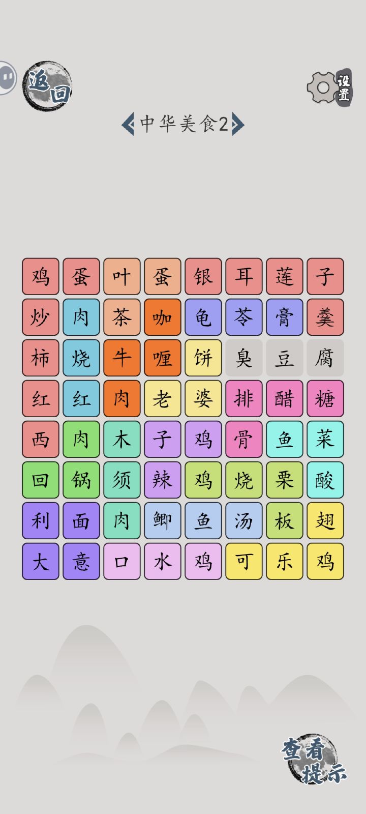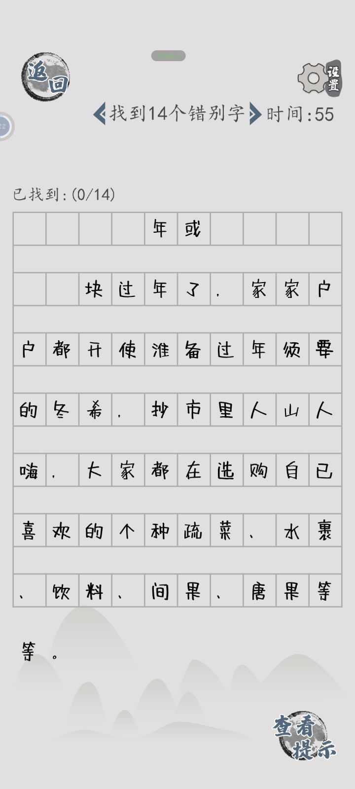 网络梗5关电视剧名3关电影名3关歌曲名3关歌词3关中华美食3关(并不全都是中华美食)绝世武功1关小品句子3关西游记角色字里找字12关歇后语连线6关(不一定完全一样,好像是有些微变化的)诗词连线4关成语连线5关我的连线1关找错别字6关断句15关(游戏里标准答案只有一个,但实际上根据语境,断句的方法不一定只有答案里的这个)找诗句6关