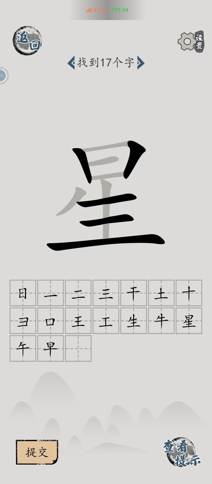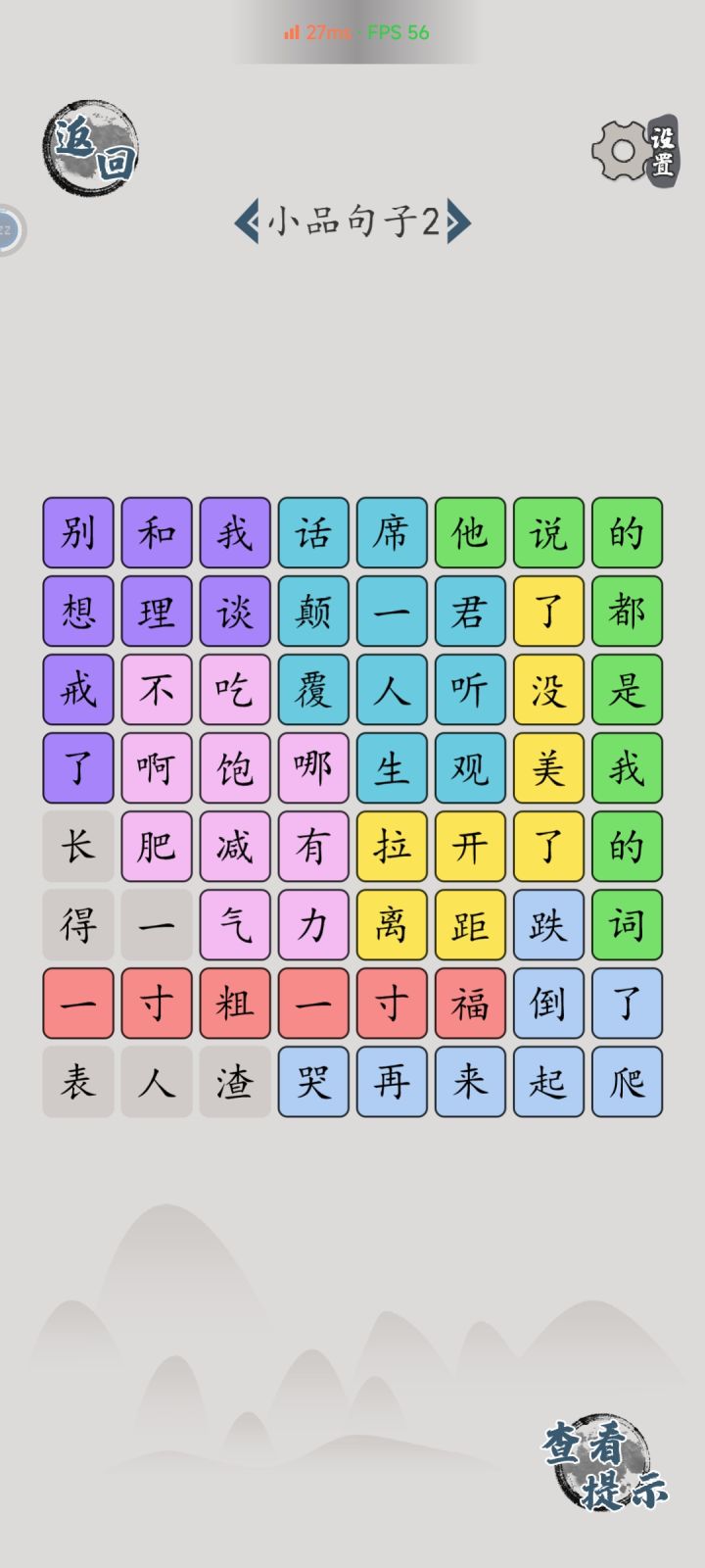 网络梗5关电视剧名3关电影名3关歌曲名3关歌词3关中华美食3关(并不全都是中华美食)绝世武功1关小品句子3关西游记角色字里找字12关歇后语连线6关(不一定完全一样,好像是有些微变化的)诗词连线4关成语连线5关我的连线1关找错别字6关断句15关(游戏里标准答案只有一个,但实际上根据语境,断句的方法不一定只有答案里的这个)找诗句6关