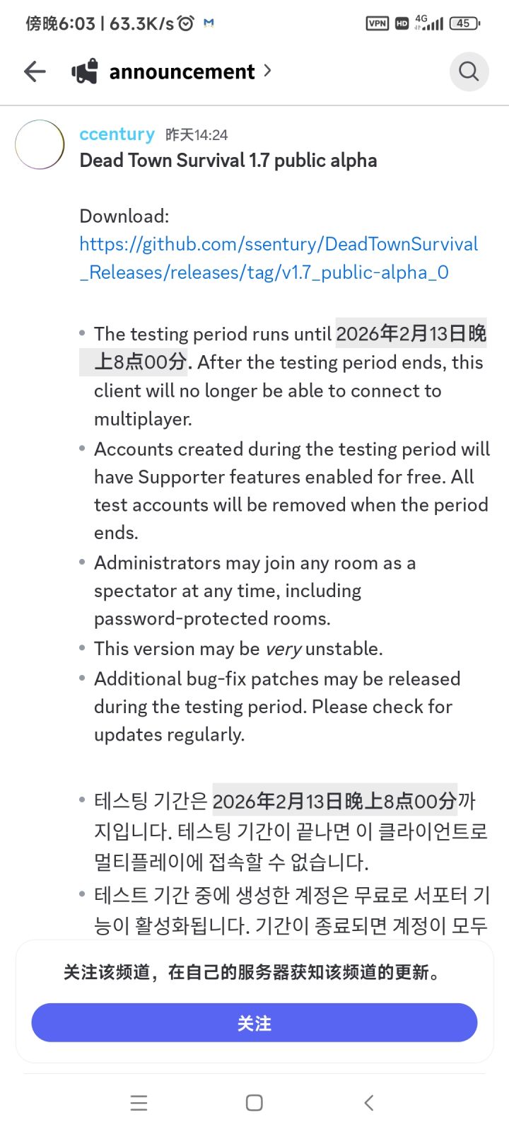 《Dead Town Survival》1.7 公开Alpha版下载地址:github.com/ssentury/DeadTownSurvival_Releases/releases/tag/v1.7_public-alpha_0 或github搜DeadTownSurvival_Releases· 测试期持续至2月13日8点。测试期结束后,此客户端将无法连接至多人游戏。· 测试期间创建的账