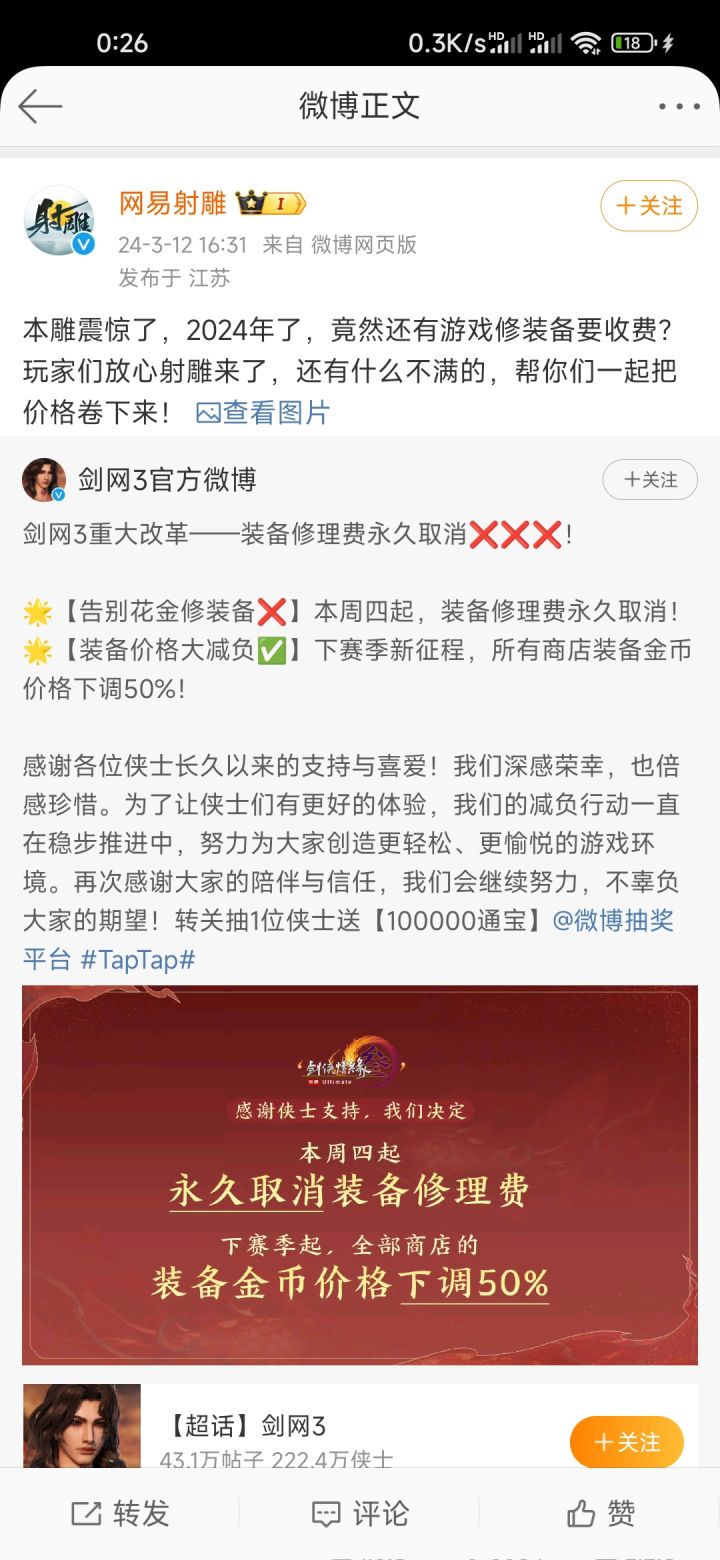 11号剑三 游戏重大改革发文称取消装备维修费用,下赛季装备价格下调冈易的射雕还没有上线就坐不住了蹭热度说要卷价格!众所周知剑三与冈易的射雕都是 古风+开放世界所以射雕上线能不能卷出实惠来呢?#今天游戏圈发生了啥#游戏讨论#游戏资讯#吃瓜爆料#国产游戏#网易