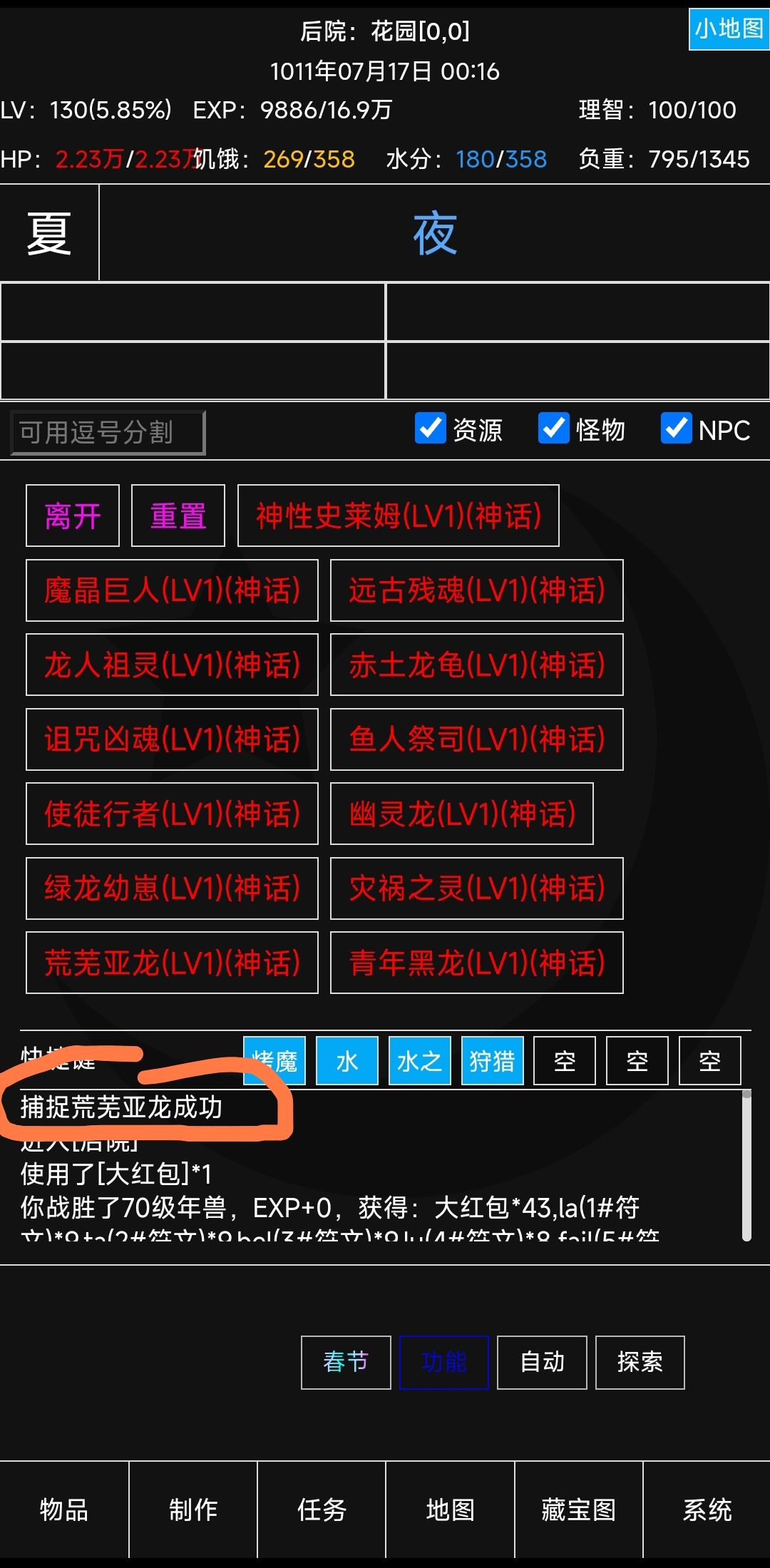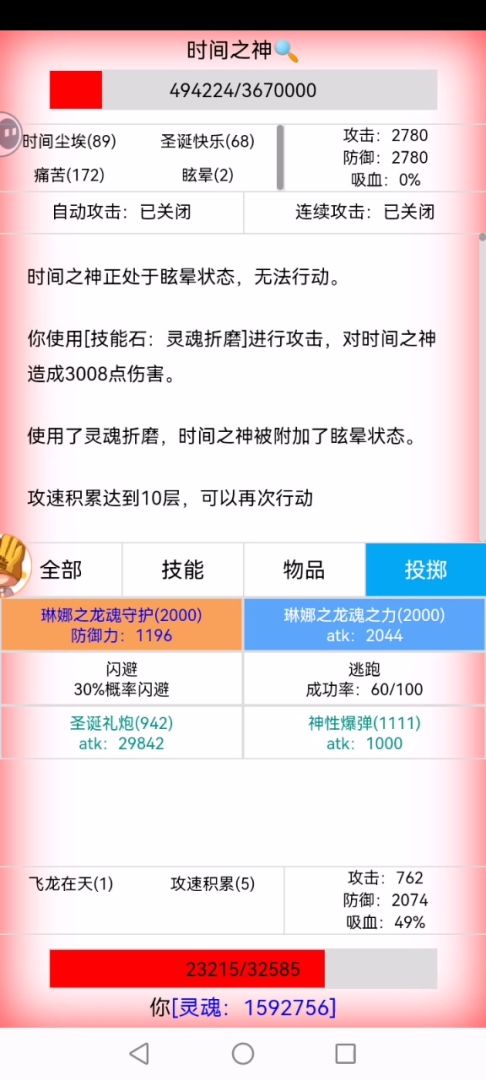 友情提示:可能需要刷脸眩晕和时间之神buff不要叠太快 准备:150+圣诞礼炮, 400+灵魂折磨(以防万一), 1灵魂出窍, 1飞龙在天, 1福到万家, 1晶甲守护, 1草编戒指(养成玩法), 1冬笋饺子。 可选:1巨龙之力, 1龙魂药剂(没用也过了,用上可以减少一些刷脸程度) 战斗:开局使用“灵魂出窍”增加攻速,接着使用“灵魂折磨”眩晕和禁疗boss, 在确保同时出现眩晕状态和5攻速积累的情况