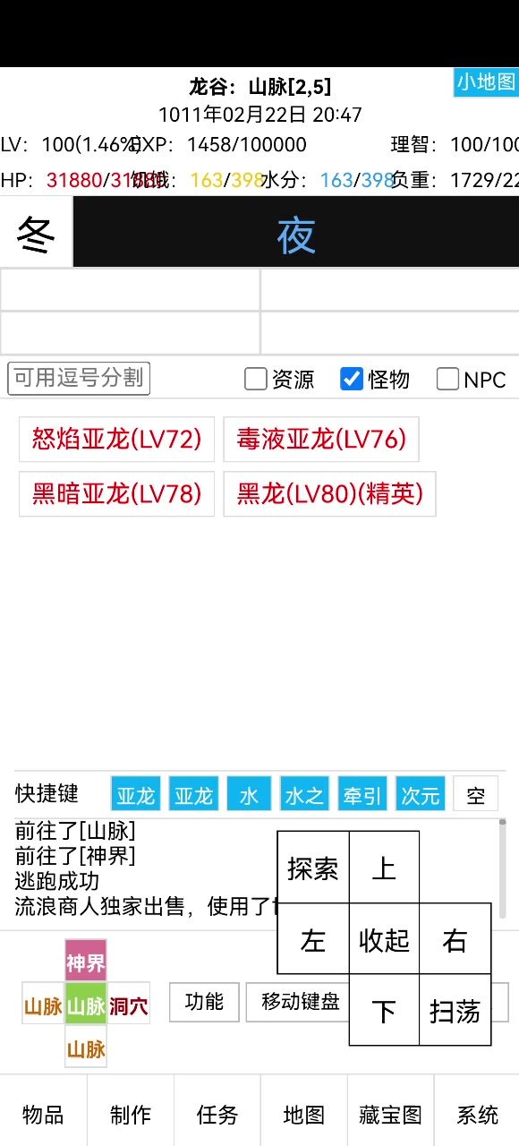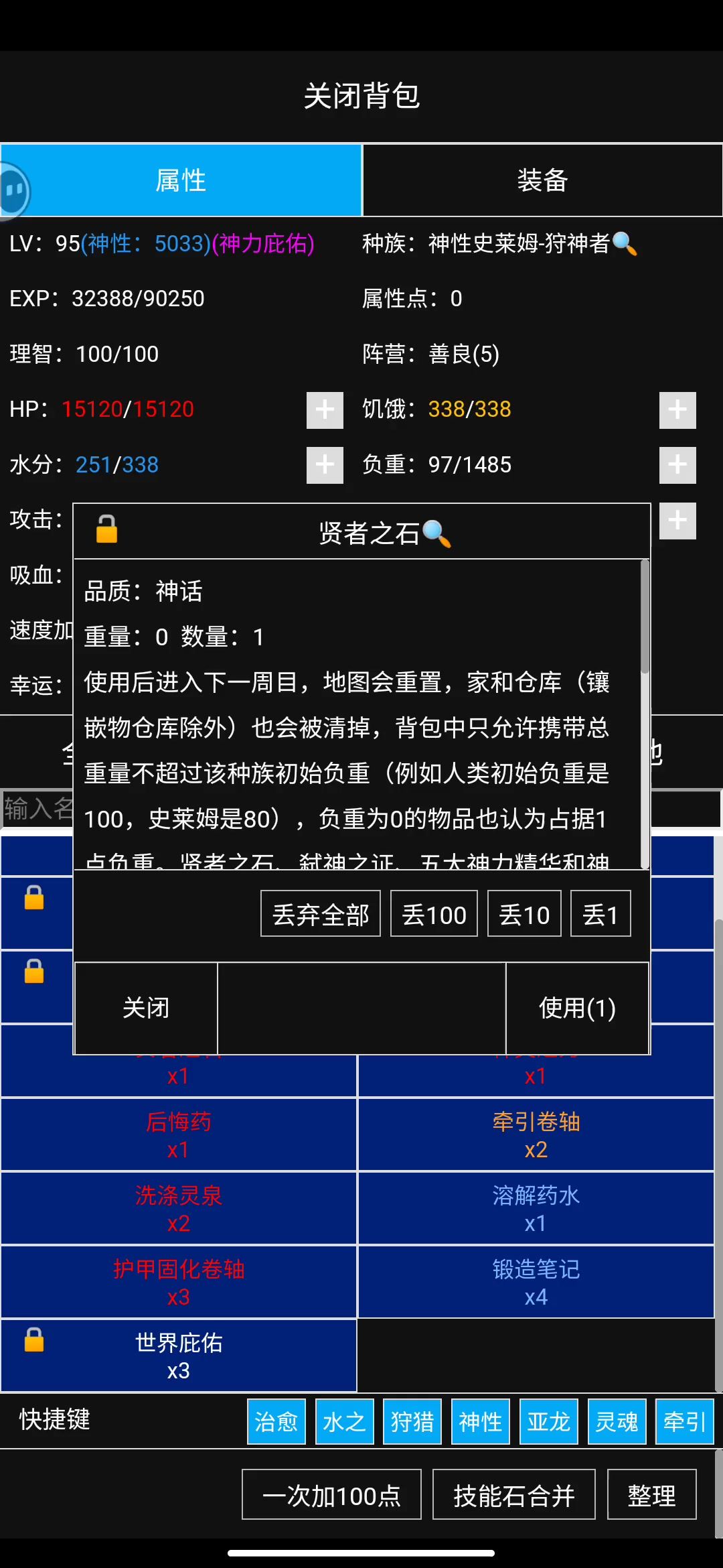 一共带了…… 武器与护甲打孔石各4,万能打孔石各3,三个护甲的固化卷轴(武器的没挖到); 一瓶溶解,两瓶洗涤,提前喝了的18瓶敏捷; 保命用的四个短程传送,三个世界庇佑,两个十字章,一个跑图专用的次元移动; 三个换钱用的神格,一个不明意义的神灵之力,全套护符+观察之眼; 然后还有……装备保养油*1 荒芜亚龙(备用坐骑)*1 次元钥匙*2 灵魂威慑*1 灵魂追猎*1 粘液*6 ……(以下省略50字)