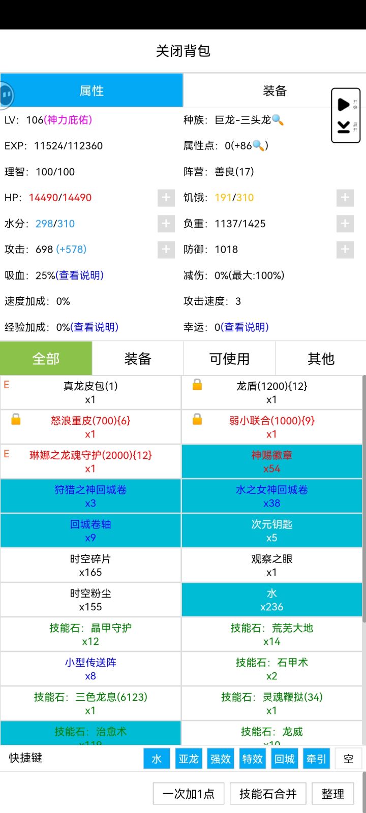 好久以前玩的时候用扑克人刮痧,再后来用机械族歼星,不过都比较半途而废,没有打到登神这次用史莱姆打,龙盾+怒浪+晶甲提供的减伤可以让史莱姆很好在双神面前叠防御力,叠满之后连点器挂两分钟就过啦时间之神就比较麻烦,去搞了个灵魂出窍和圣诞礼炮才过晒一个极品琳娜龙魂