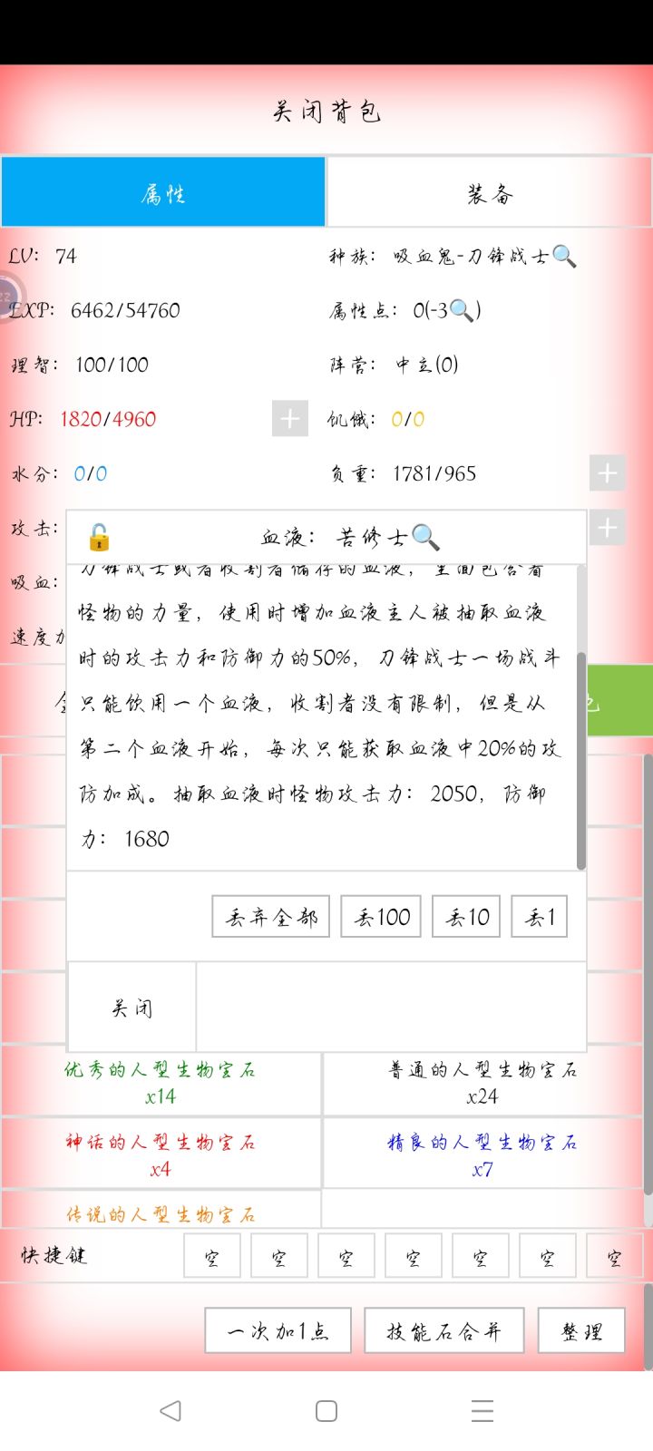 转刀锋战士,打苦修士到5%血后一直闪避,怪就会给自己加属性,在怪攻击能破防时至少攻击力是你防御的83%,怪的攻防同步成长防御也至少是你防御的80%,这时候把它吸了。找下一只苦修士,开局喝血把攻防提升至至少140%,如此循环操作。因为是1.4的指数提升刷20遍就能把攻防提升至1000倍(一般不会刷这么高,任意失误被一刀秒)。