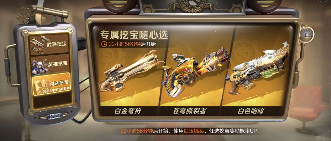 上线时间:创角后第4天0点(最快于4月21日0点开启) 卡池说明:通过挖宝入口-自选挖宝-选择自选的武器开启。 挖宝道具:红玉镐头 获得方式: ·在商城-钜惠热卖-限时推荐中购买,每周10次蓝宝石购买; ·在商城-礼包商城-特惠礼包,永久3次蓝宝石购买; ·或直接通过红宝石进行购买。 玩法介绍: 自选挖宝,可以选择白金穹狩(狙击枪)、苍穹撕裂者(加特林)、白色咆哮(霰弹枪)3类武器