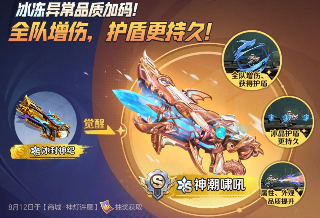 指挥官们大家好呀~大家心心念念的传说武器觉醒终于来啦!“冰封神纪”的武器觉醒, 武器技能和威力将会更加强大,助力指挥官的合金冒险!先跟着留美来看看它都有哪些特点吧~ 内容目录 1冰封神纪-武器详解 2神潮啸吼-觉醒详解 3冰封神纪-升星特性 神潮啸吼首发时间 8月12日上线(实际上线时间以游戏内为准) 冰封神纪-武器详解 喷冰枪作为游戏内目前唯一一把能提供冰冻状态的武器,具有极其特殊的地位,它的射