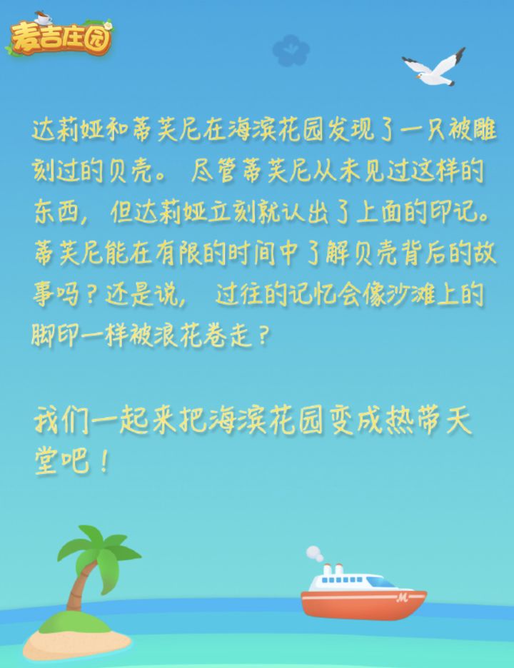 🌊达莉娅和蒂芙尼在海滨花园发现了一只被雕刻过的贝壳。🥥尽管蒂芙尼从未见过这样的东西,但达莉娅立刻就认出了上面的印记。🐚蒂芙尼能在有限的时间中了解贝壳背后的故事吗?还是说,过往的记忆会像沙滩上的脚印一样被浪花卷走? 🌴我们一起来把海滨花园变成热带天堂吧!#发现好游戏 #游戏日常