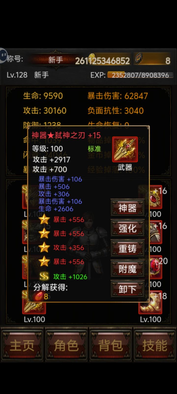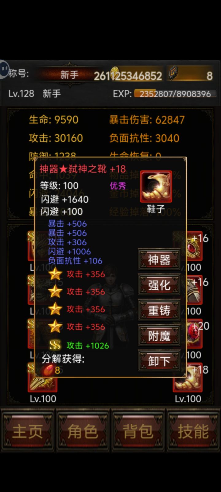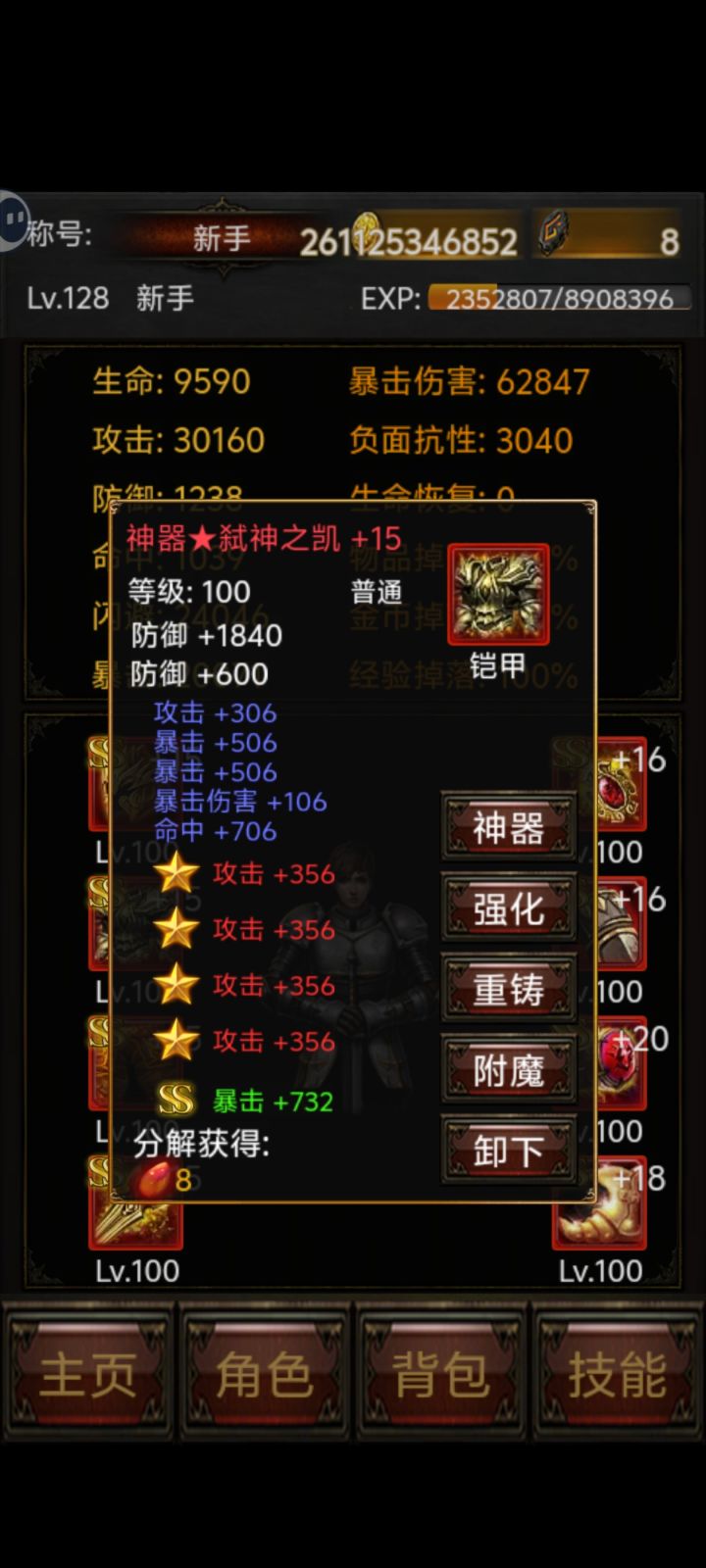 这游戏还是以挂机为主,打造的装备毫无作用,属性只有攻击暴击闪避有用,前期只要堆闪避,可挂副本就行,其余挂低级能秒杀的,多刷卷,左边神器副本出,右边箱子出,注意bug箱子前先把副本卷用完。2万是个零界点,100%暴击100%闪避