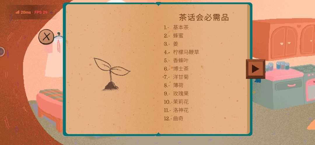 餐桌上拿到《茶叶百科》,出门直走猫头鹰奥托处拿到《地图》。 〓以下编号为我个人收集顺序〓 ①薄荷: 【集市】与獾子莱恩对话,为其整理摊位得到薄荷线索, 【池塘】左转找蜥蜴萨拉曼多比赛游泳, 【草地】蜥蜴萨拉曼多家里拿到薄荷,解锁{广场}{东部森林}{郊外}。 ②蜂蜜: 【广场】找老鼠伯托尔对话,去邮局找信鸽文森特对话订阅漫画月刊,完成邮票拼图小游戏得到蜂蜜线索, 【西部森林】爬木梯上木屋找猫头鹰奥