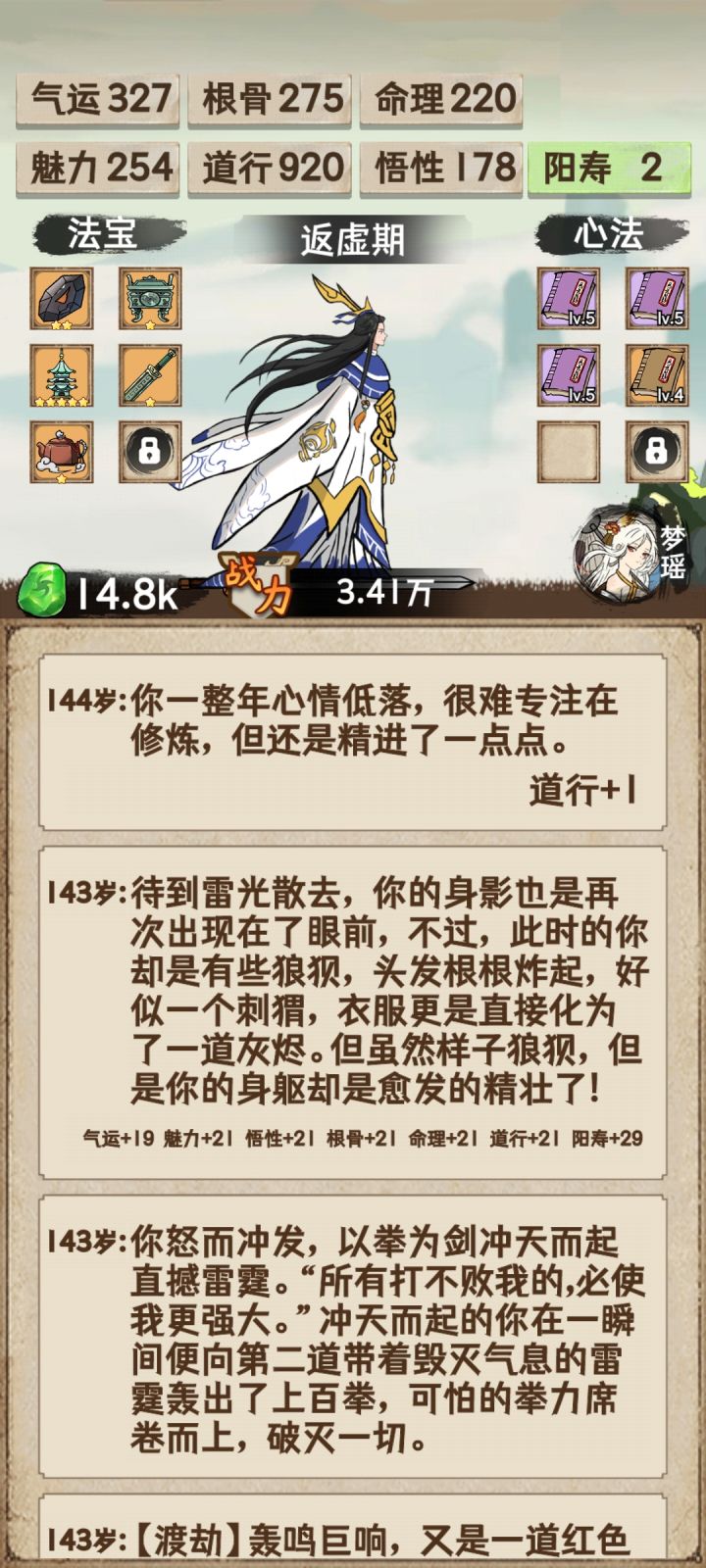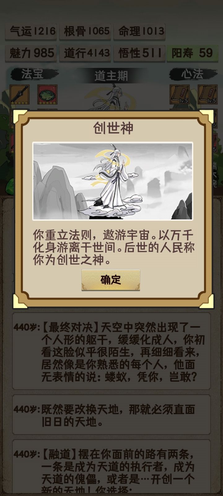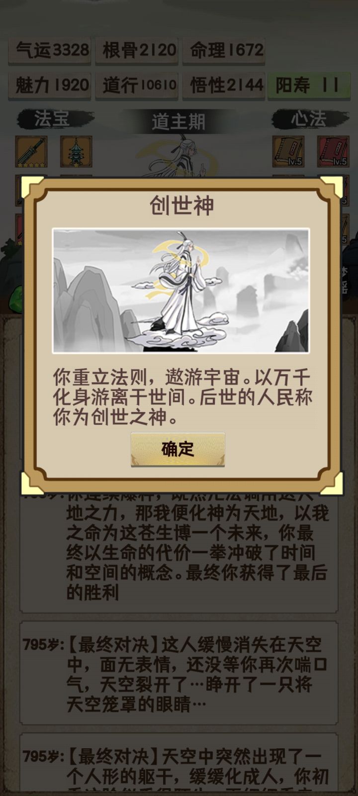 通关了留个纪念,顺便说一下个人思路与体会。1、目前难度应该是有大调整过的,因为有看到其它道友4000左右道行就能通关创世神,但在我玩的这个版本里面,4000可能还过不了仙君瓶颈。2、这次通关突破瓶颈方式主要还是以道行为主,因为玩家渡劫是先手的,只要道行达到某个值,就能先手一刀秒天劫,所以战力根骨都是浮云,道行才是最重要的。3、贴一下我突破的各个境界所需道行。 创世神:10610 (猜测最低