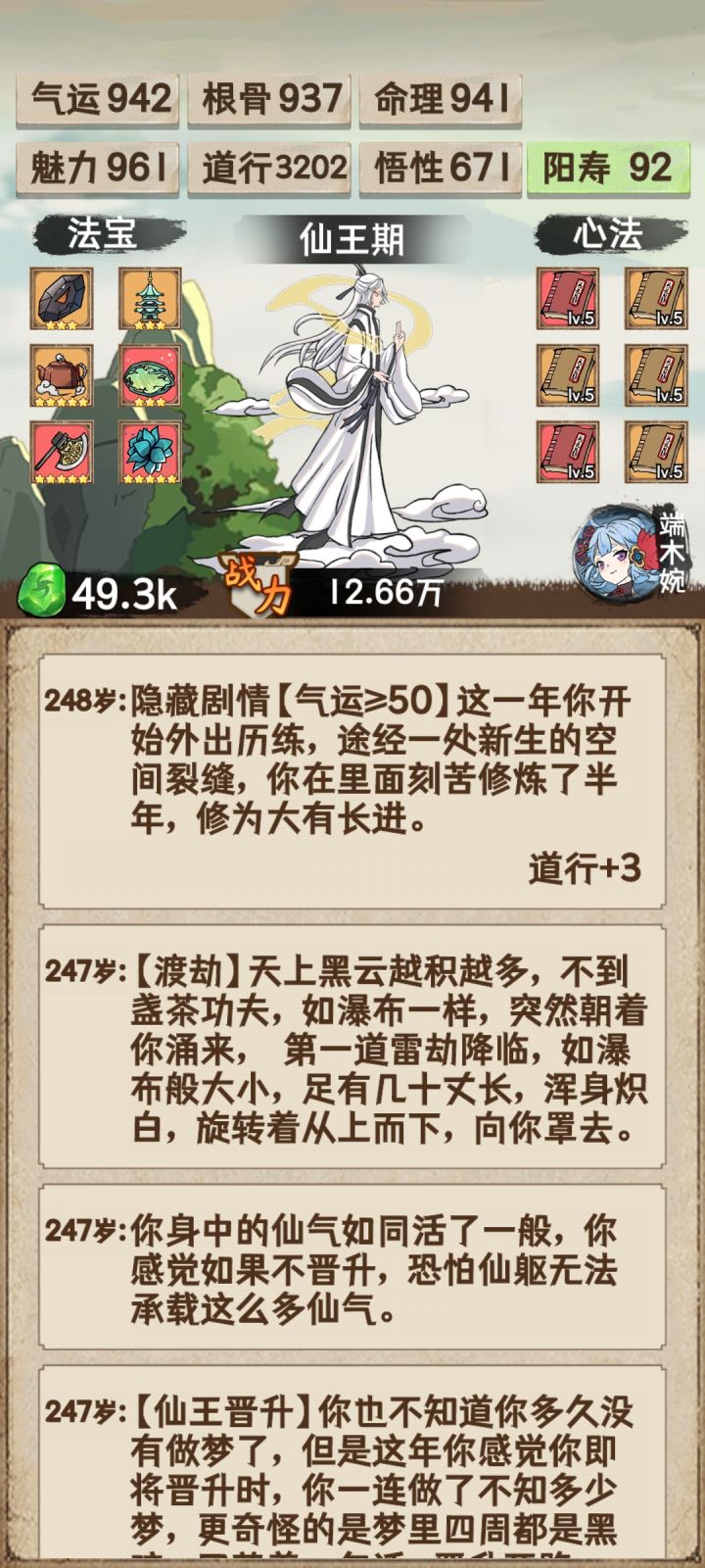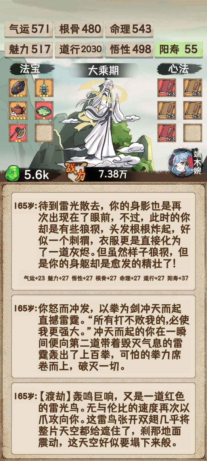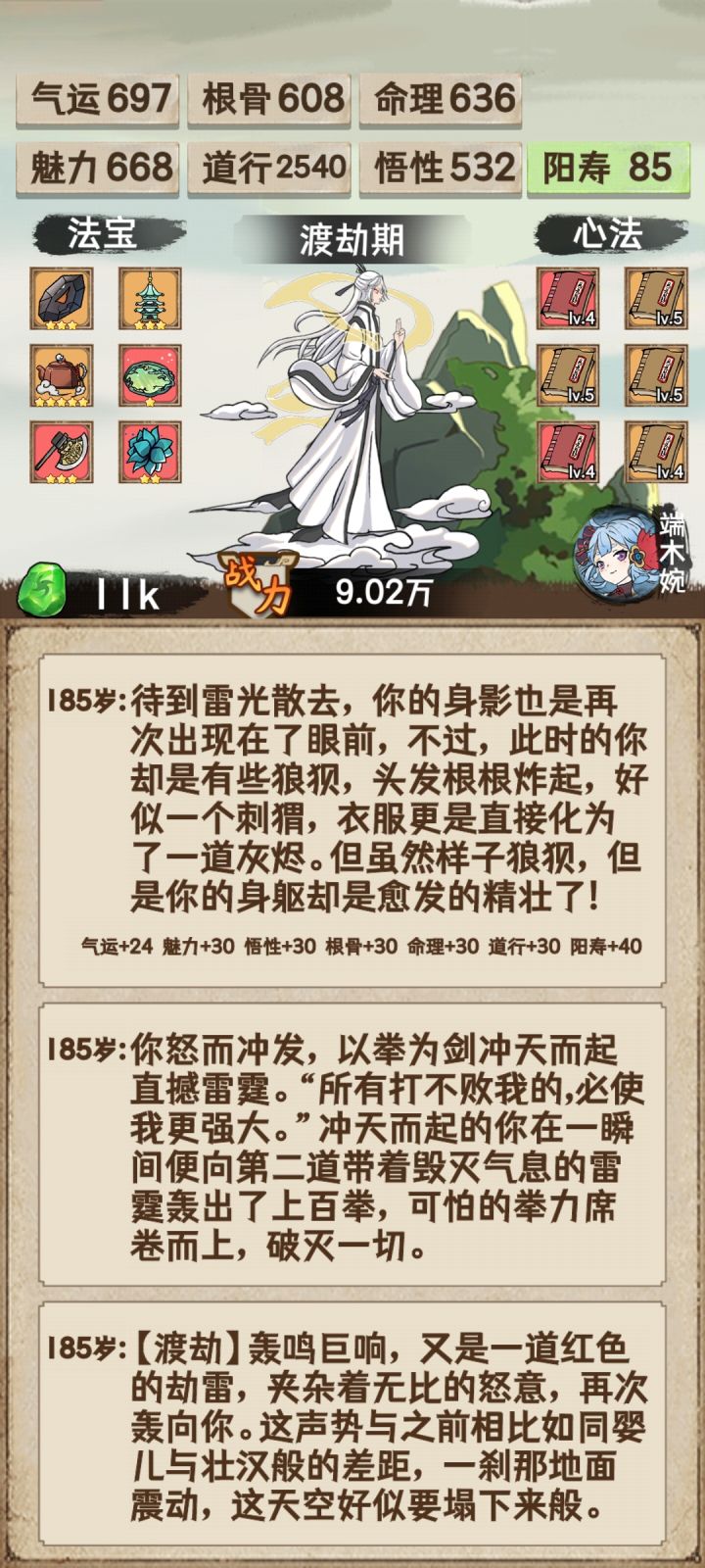 通关了留个纪念,顺便说一下个人思路与体会。1、目前难度应该是有大调整过的,因为有看到其它道友4000左右道行就能通关创世神,但在我玩的这个版本里面,4000可能还过不了仙君瓶颈。2、这次通关突破瓶颈方式主要还是以道行为主,因为玩家渡劫是先手的,只要道行达到某个值,就能先手一刀秒天劫,所以战力根骨都是浮云,道行才是最重要的。3、贴一下我突破的各个境界所需道行。 创世神:10610 (猜测最低
