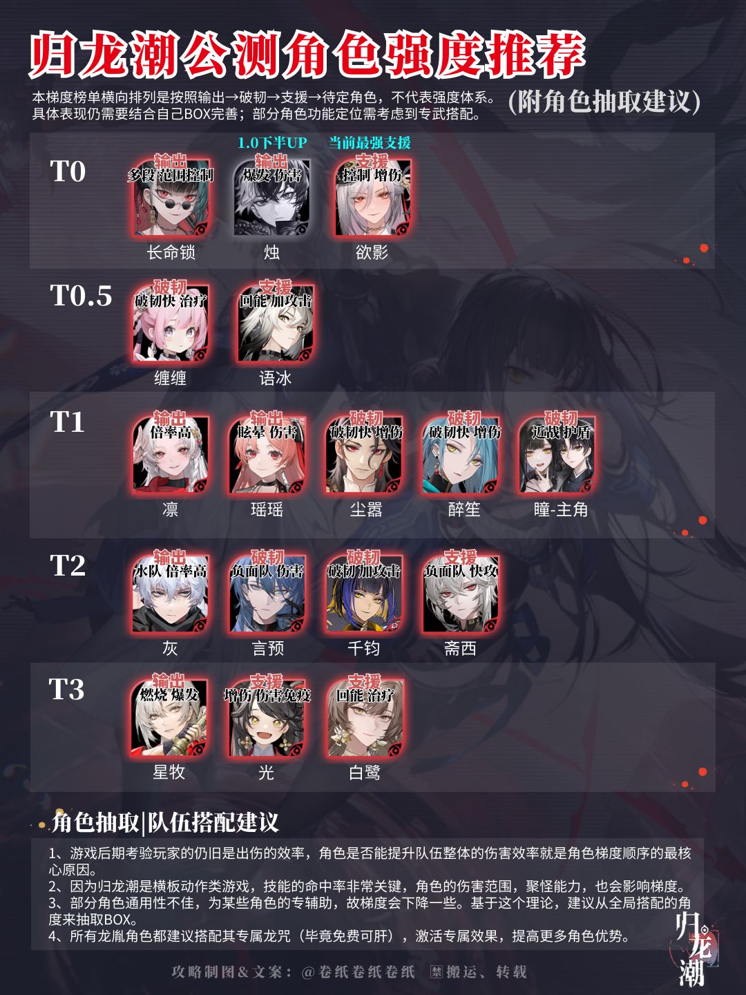 哈喽,这里是卷纸卷纸卷纸! 今天给大家带来归龙潮公测角色强度推荐(包括1.0下半UP角色烛)! 关于角色强度的一点点小说明: 1、游戏后期考验玩家的仍旧是出伤的效率,角色是否能提升队伍整体的伤害效率就是角色梯度顺序的最核心原因。 2、因为归龙潮是横板动作类游戏,技能的命中率非常关键,角色的伤害范围,聚怪能力,也会影响梯度。 3、部分角色通用性不佳,为某些角色的专辅助,故梯度会下降一些。基于这个理论