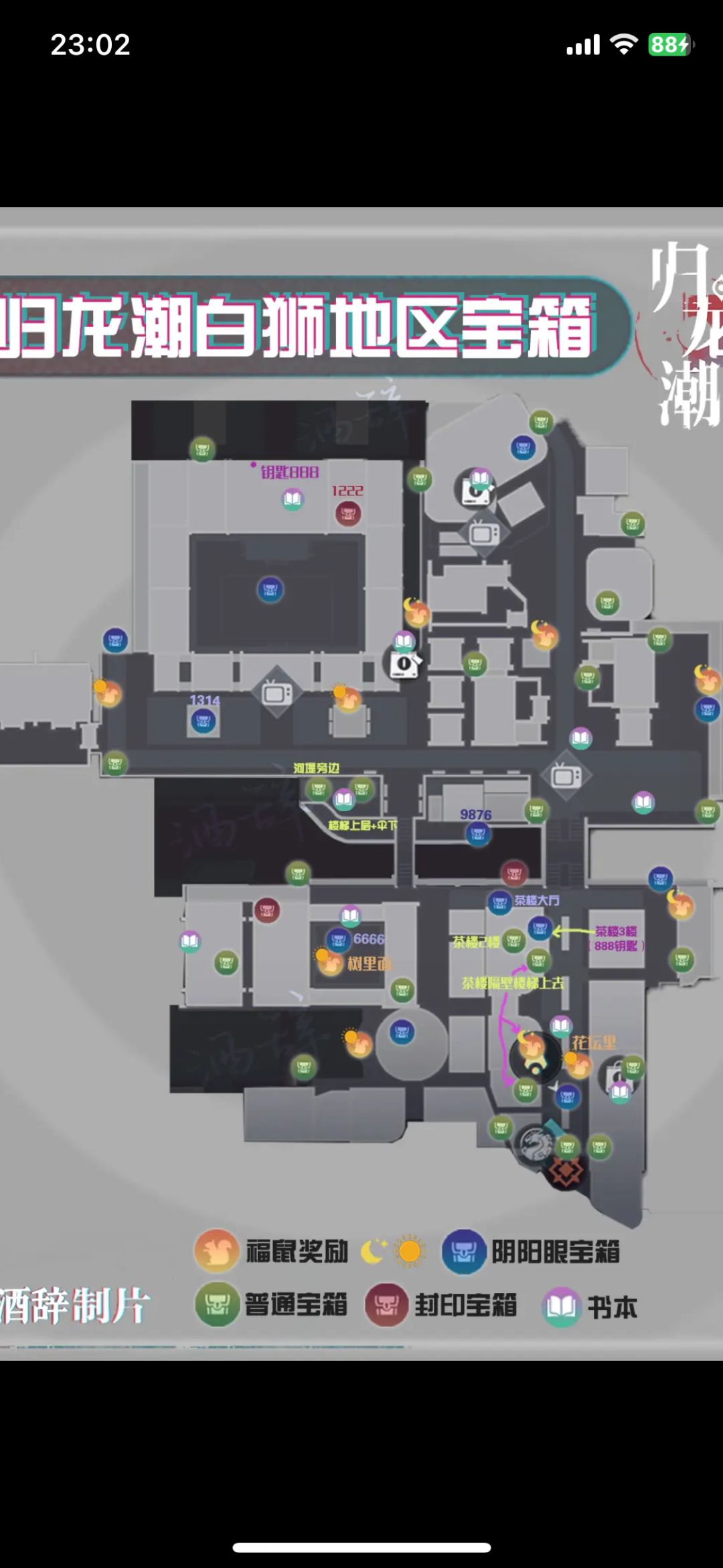 包含: 25个普通宝箱 3个封印宝箱 10个福鼠 10本书 12个阴阳眼宝箱 P.S:地图上已标记密码,福鼠分白天和晚上也标记了,888号钥匙标注点位了,比较密集建议收藏保存慢慢找 #归龙潮龙吟狮醒大版本创作征集