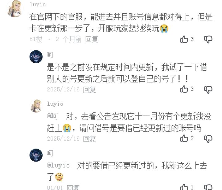如图,了解到可以这样借号更新,我自己就是没有在11.13-12.10之间更新过现在甚至换了设备导致有软件也没法更新,所以有没有兄弟借个官服保留了的号来更新