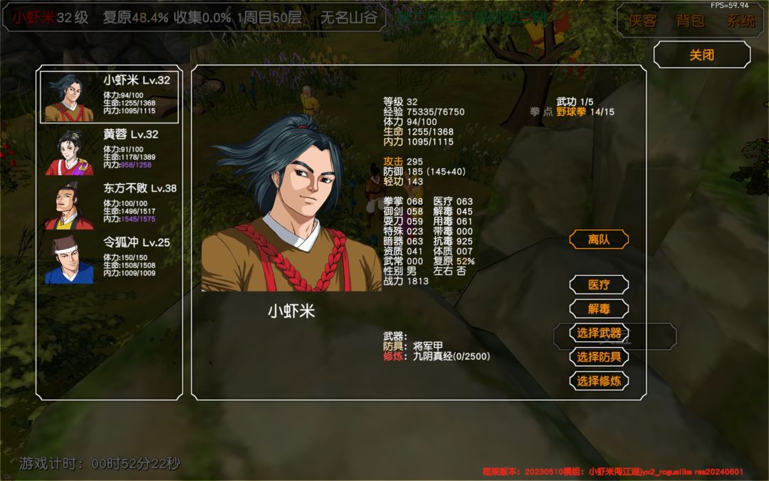 1、前期不应该培养低资质,没选林平之但选了个更难培养的石破天,174层才学一个15级技能,然后就踢了 2、不知道黄蓉得打狗棒法属于啥,200层还没学技能 3、运气也不咋地,111层才出不灭心法 4、拳没啥用,最好的降龙是单体,可惜把阿紫练了拳,用剑多好,能学独孤剑 5、想练的阵容:2-3个单体,7-8个剑群