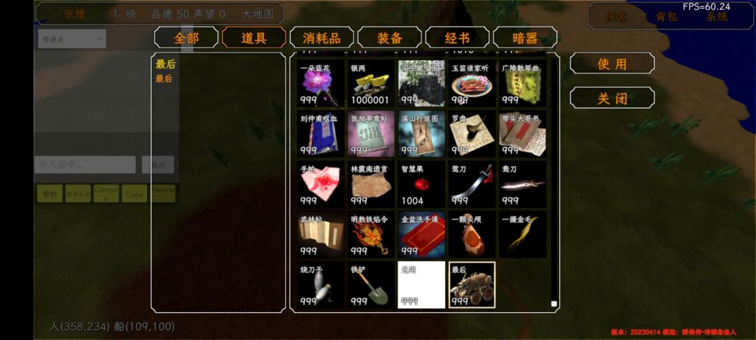 Hello!兄弟们。找了一个晚上,啥也没找到。 网上只有金庸群侠的,渡城残魂传的没有。 没办法,只能靠自己翻找游戏代码长达4个小时。(从0,1,2,3开始,一个数字一个数字扣,只有一部手机😭😭😭) 心血来潮,准备分享一波,持续更新中。。。 最近疫情被封控在单位,一边上班一边更新,可能有点慢,希望大家谅解 游戏控制台代码: 输入没有效果就取消“{}”直接写上ID,记得前面加空格。大概意思就是(如图)