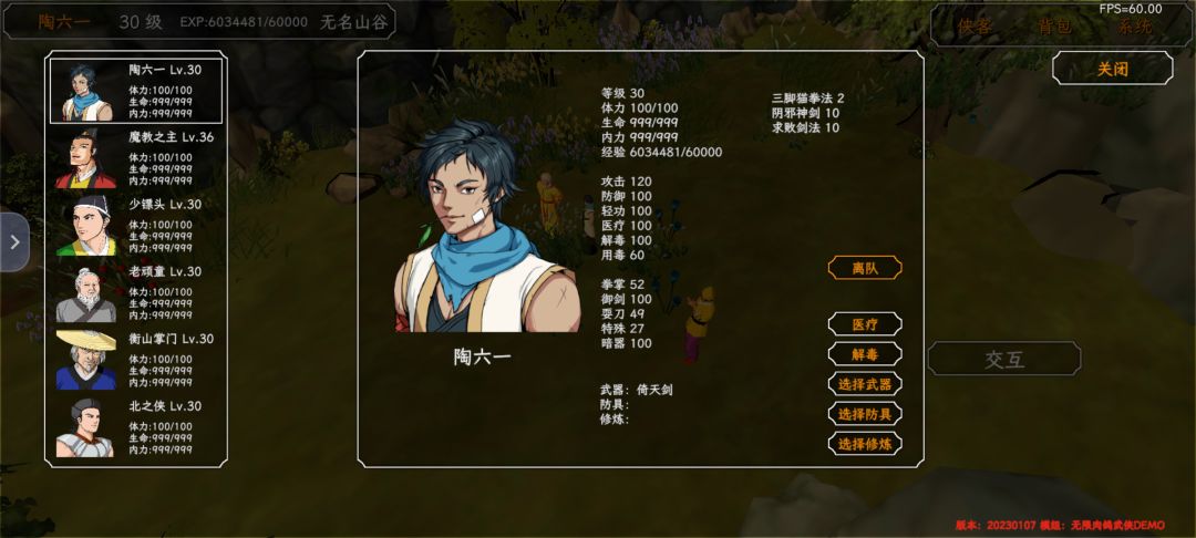 写个大致流程希望能帮助刚接触这类游戏的玩家,查缺补漏,大佬别笑。 整个世界分上下左右四个门派+罂su谷五个门派,主角是右边门派的掌门,年轻有为英俊潇洒武功高强,有一位年轻貌美身材惹火的夫人羡刹旁人,更是武林盟主的热门选手,一天酒宴过后突然横死家中,不得死因灵魂不得超生,在鬼二代的帮助下附身在小乞丐六一的尸体上调查自己的死因。 开局选属性医疗30,御剑武力轻功越高越好,30最佳。 1.在自己家交互自
