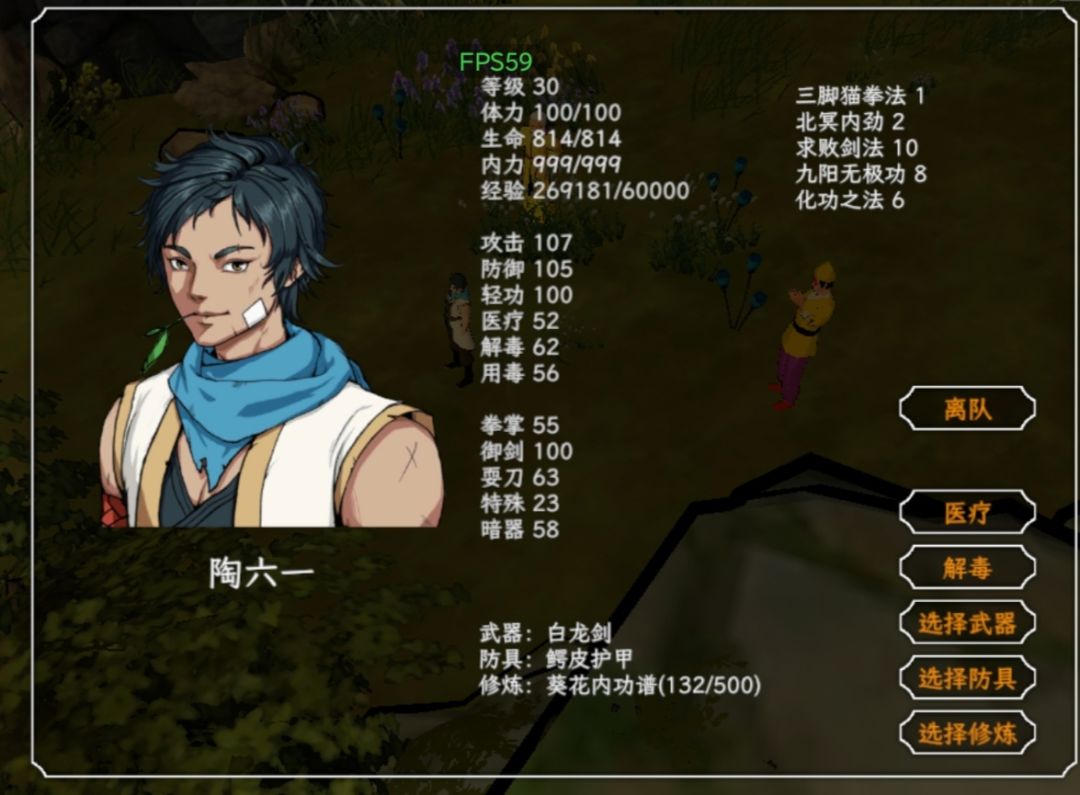 开局埋尸体,不用挖出来,有钥匙开屋里宝箱获得技能很强,重复不挖尸体增加资质,技能升级快一点 然后在大地图拉人,分别是鸽子楼师弟,然后牛头岭妞妞,山庄胖子,寺庙和尚,山谷谷主,药店老板,,我反正就这拉了这些 去打熊,多打几次,不刷新就可以了 现在基本有一定战力在去剑阁打二个弟子 然后就是注意多逛地图,多存档,剧情就慢慢过了 客栈能回血回蓝,一百两 寺庙心法和轻功能刷到上限 剑阁有个武器店,大饼能加生命上限