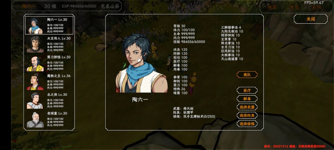 一拳超人小虾米,野球拳 拳拳烈火。 主角 野球拳+双手+含沙射影(带毒) (九阴或葵花堆属性,双手野球稳定1000+伤害,直接打死一个比打伤一堆有用) 郭靖 自带降龙+九阳+双手+含沙射影 林平之 辟邪+九阳+双手+含沙射影 老顽童 辟邪+九阳+双手+含沙射影 风清扬 自带九剑+化功(带毒)+北冥(吸蓝)后续补九阳+辟邪 东方不败 自带葵花+化功(毒)+北冥/吸星(吸蓝) 除东方不败外都能用武器,所有角色武学练完后可以学葵花或九阴补属性。 目前还没毕业,打到一百多层,往后应该也没有压力。凑了很久因为要更新mod怕丟档,所以发一下。 现在问题有 能学双手的资质基本都差,练功慢,成型慢。 蓝不耗光角色是不会用北冥和吸星的,补属性后蓝太多,这俩基本白学。 含沙射影和化功大法的毒伤害低,只能说聊胜于无。 基于小虾米mod,原版不完全适用,部分角色可以用其他人替代。