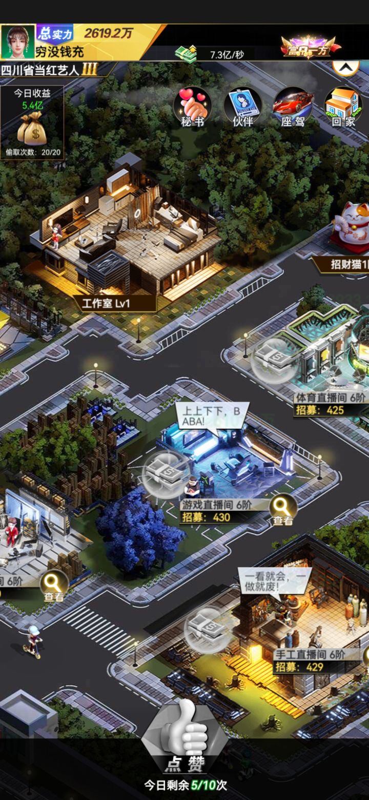 如果把赚速比喻成一个房子,那么直播间等级是地基,伙伴是栋梁,座驾是墙壁,配饰是门窗,其他的就是装饰了。决定秒赚高低的主要就是伙伴培养和直播间升阶了,其次就是座驾,配饰,手办,藏品等因素了。配饰:配饰的话就选项链,座驾手办等就是最好的东西配给最高的伙伴。伙伴:红色伙伴不分直播间,都是60%加成,而橙色紫色伙伴要根据每个伙伴的技能加成放置在相应的直播间,才能达到最大的收益化。伙伴的每次升星