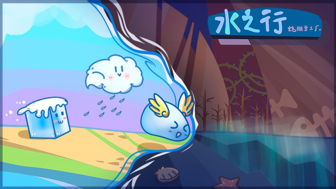游戏主要玩法为通过水的特性转化(固:移动缓慢但是有一定重量且十分坚固可以通过一些危险地带如沼泽。液:小水球的正常状态,移动速度中等,可以通过复杂地形,容易蒸发。气(云):移动速度快且可以上升一定距离)