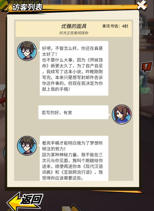 今天小师妹和大家来聊一聊访客系统。访客系统一直是师妹饶命最神秘最有趣的系统之一。在访客任务中小师妹会遇到各种有趣又好玩的陌生访客,访客任务会随机触发,更能通过互动来增加访客系统的趣味性。在小师妹下山修炼过程中,会遇到各种各样的人物和情况。所以会经常遇到陌生人的拜访,有客气的读者,有凶神恶煞的坏人,有无厘头的搞笑人士等等等等。让小师妹带大家看看第一位访客来找小师妹干什么?似乎是一个《师妹饶命