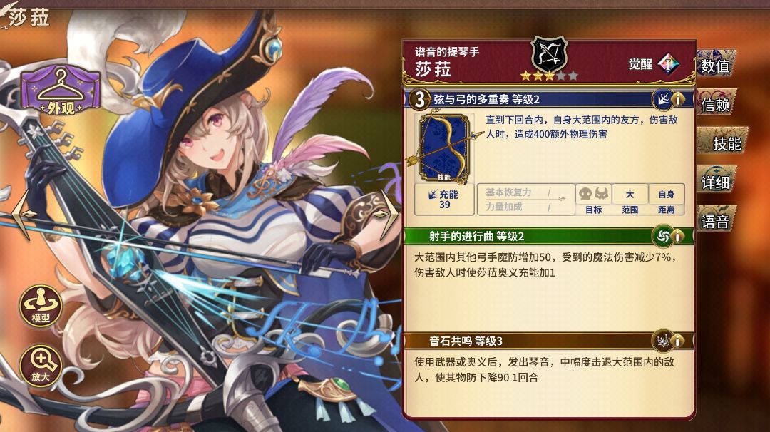UID2011569 官服 第一篇角色详细解说攻略,今天要介绍的是弓队鸡肋——莎菈 属性:莎菈作为一个弓箭角色,力量低得可怜,导致在竞技场即便有艾莉诺拉加攻击力的情况下,打剑士职业经常只能造成1点伤害,除了用陷阱弓,她自身输出就是个笑话,智力居然反而比力量高,但弓箭卡牌很少吃智力加成,双防还行但血量偏低,所以还是很脆,移动11速度10这俩个属性还可以 专武:天青的重奏,1费,228攻击力,使用后减