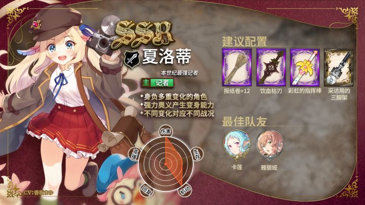 全新SSR店员-本世纪最强记者·夏洛蒂登场!职业:剑cv:香坂まゆ从开服以来一直在各处出没,力量异常强大的神秘记者。乍看之下是个纯真可爱的少女,实际上却是个为了人气不择手段,喜欢欣赏别人被愚弄的样子的狠角色!每天都为了垄断整个新闻业界而四处努力着。拥有着「记者」定位的夏洛蒂,有着足以扭转战场局面的强力奥义技能,能够变身三种不同的型态,灵活对应不同的战况。而夏洛蒂的助手「米米」亦会出现在主人