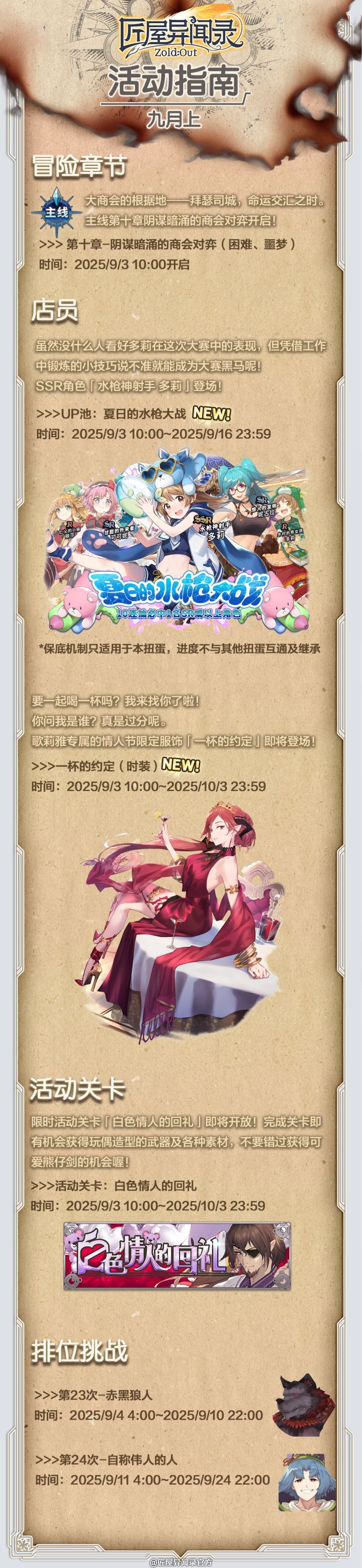 舞姬穿上了妩媚动人的酒红色礼服,仿佛让自身化为了甘甜的葡萄酒,在这个情人节格外惹人心醉。你,要与她一起品尝情人节的美酒吗? 歌莉雅专属情人节限定服饰「一杯的约定」即将登场! 礼包通贩时间:2025/9/3 10:00~2025/10/3 23:59 *注意,服装礼包不包含角色哦~