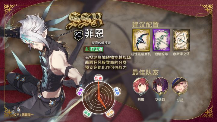 全新SSR店员-苍穹的俯视者·菲恩登场!职业:弓cv:黑田浩一即使在翼人之间也是令人畏惧的存在颤抖吧,臣服于那压倒一切的力量之下!神秘的黑翼之人,来袭!