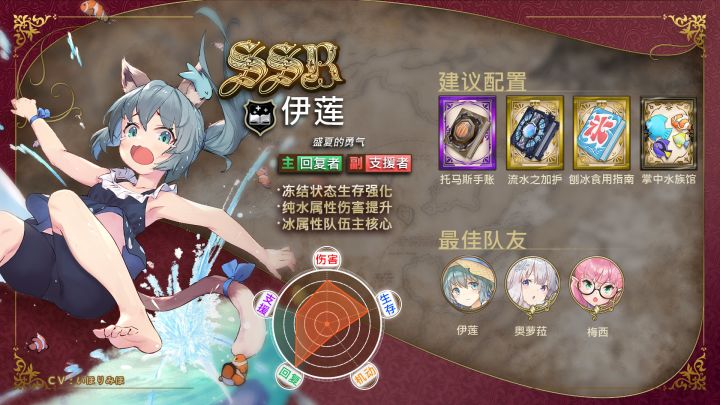 下,下次再这样对我的话,我可是会生你的气的哦! 特别成长的SSR店员-盛夏的勇气-伊莲登场! 职业:书 特色:强化冰队生存力,提升纯水伤害,属于冰队的支援核心。