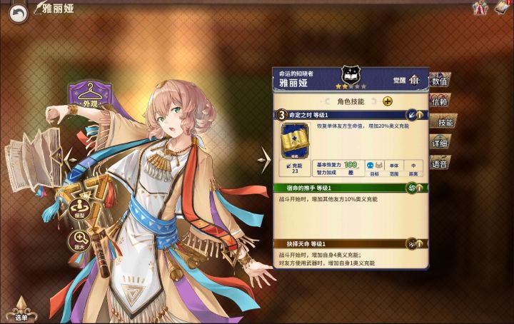 各位店主上午好呀~今天分享给大家的是一位SR稀有度的辅助雅丽娅。 SR 雅丽娅(辅助) 主线推荐度:★★★☆☆排名战推荐度:★★★★☆(召很多小怪在一起的Boss)PVP推荐度: ★★★★★ 奥义“命定之时”可以恢复单体友方生命值,增加奥义充能(满级时增加40%)。技能“宿命的推手”可在战斗开始时,增加其他友方奥义充能(满级时增加30%)。技能“抉择天命”可在战斗开始时,增加自身奥