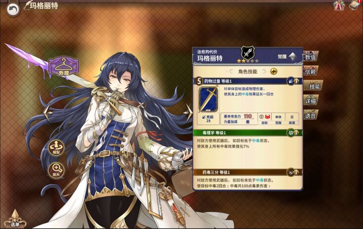 各位店主上午好呀~今天给大家分享一位SR稀有度的毒属性战士玛格丽特。 SR 玛格丽特(战士) 主线推荐度:★★★★☆排名战推荐度:★★★★★(对毒抗低Boss时)PVP推荐度:★★★☆☆ 奥义“药物过量”对单体目标造成物理伤害,使其身上的中毒效果延长(满级时延长两回合,如目标处于中毒状态,满级时恢复1650生命值)。技能“毒理学”可让角色武器攻击已处于中毒状态的敌人后,强化所有的中